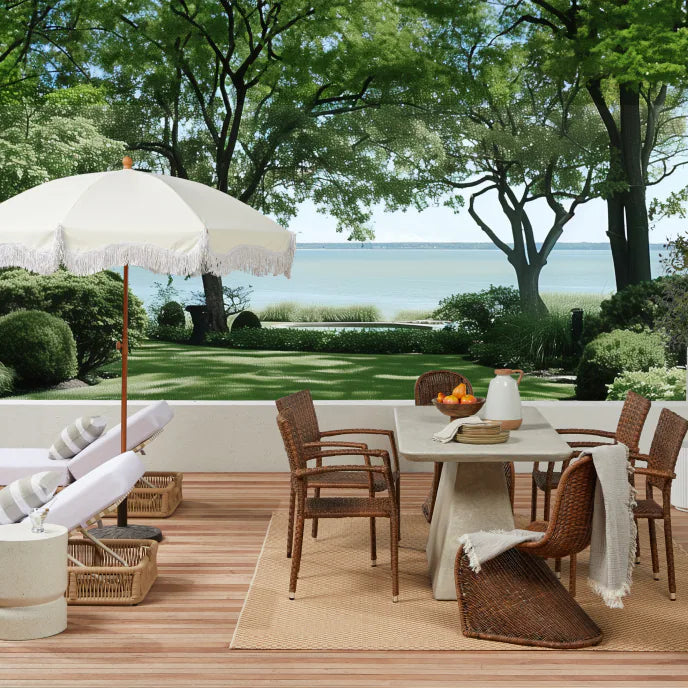 Sur cette terrasse, nichée dans la nature, un mobilier raffiné crée un havre de paix unique. Les chaises en rotin, à la texture naturelle, créent une atmosphère enveloppante. Une table à manger simple offre un cadre idéal pour de délicieux repas et des moments de convivialité. Un parasol filtre la lumière et offre une ombre agréable.