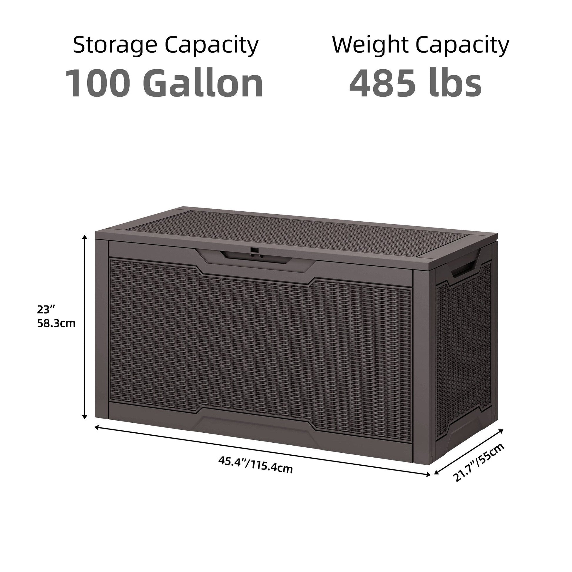 - Notre coffre de rangement extérieur a une capacité de 100 gallons et mesure 47,6 pouces de long x 21,2 pouces de large x 24,8 pouces de haut.