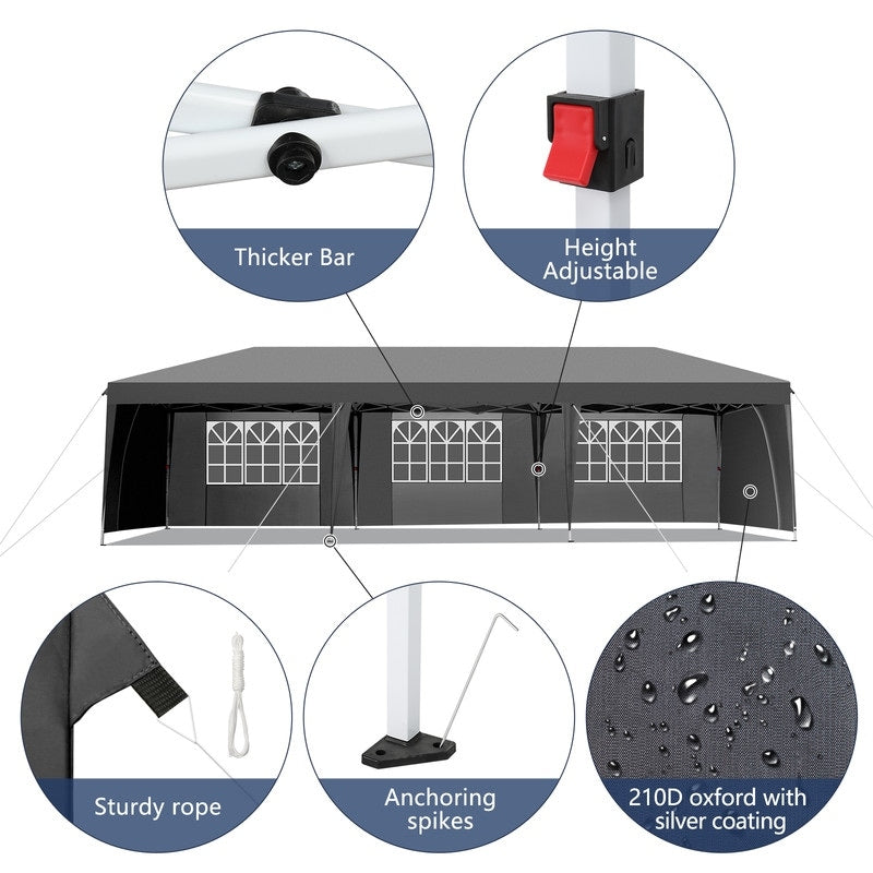 Gazebo pop-up en tissu Oxford 30 x 10 pi avec 8 sacs de sable et 8 parois latérales, avec auvent pour sac de remorquage - 30 x 10 x 8,8 pi (l x h)