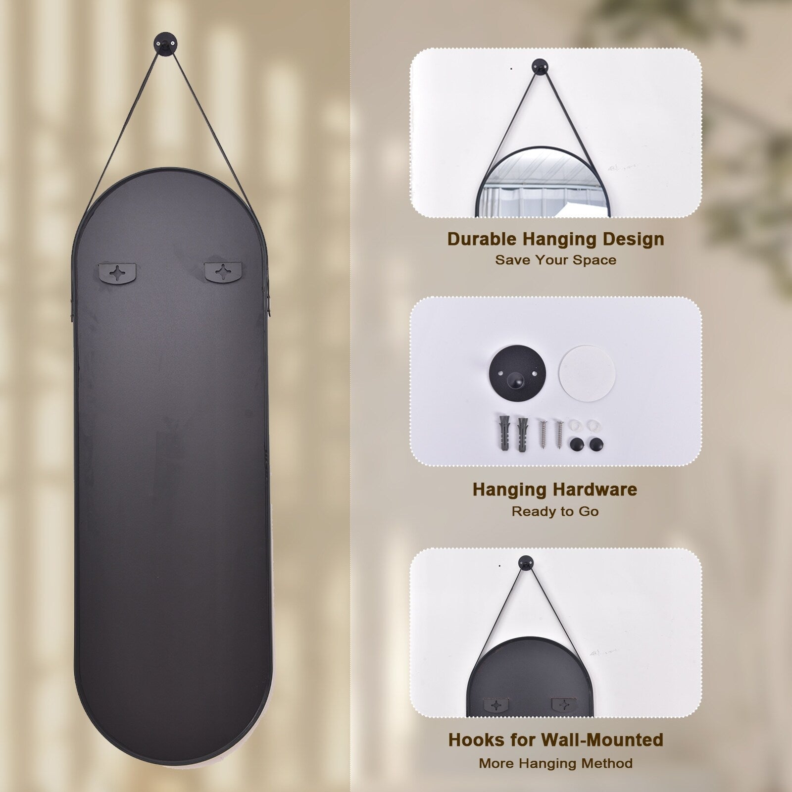 - Notre miroir ovale est doté d'un cadre en alliage d'aluminium et d'une lanière en cuir pour la suspension, contrairement aux miroirs en bois de mauvaise qualité ou en caoutchouc bon marché.