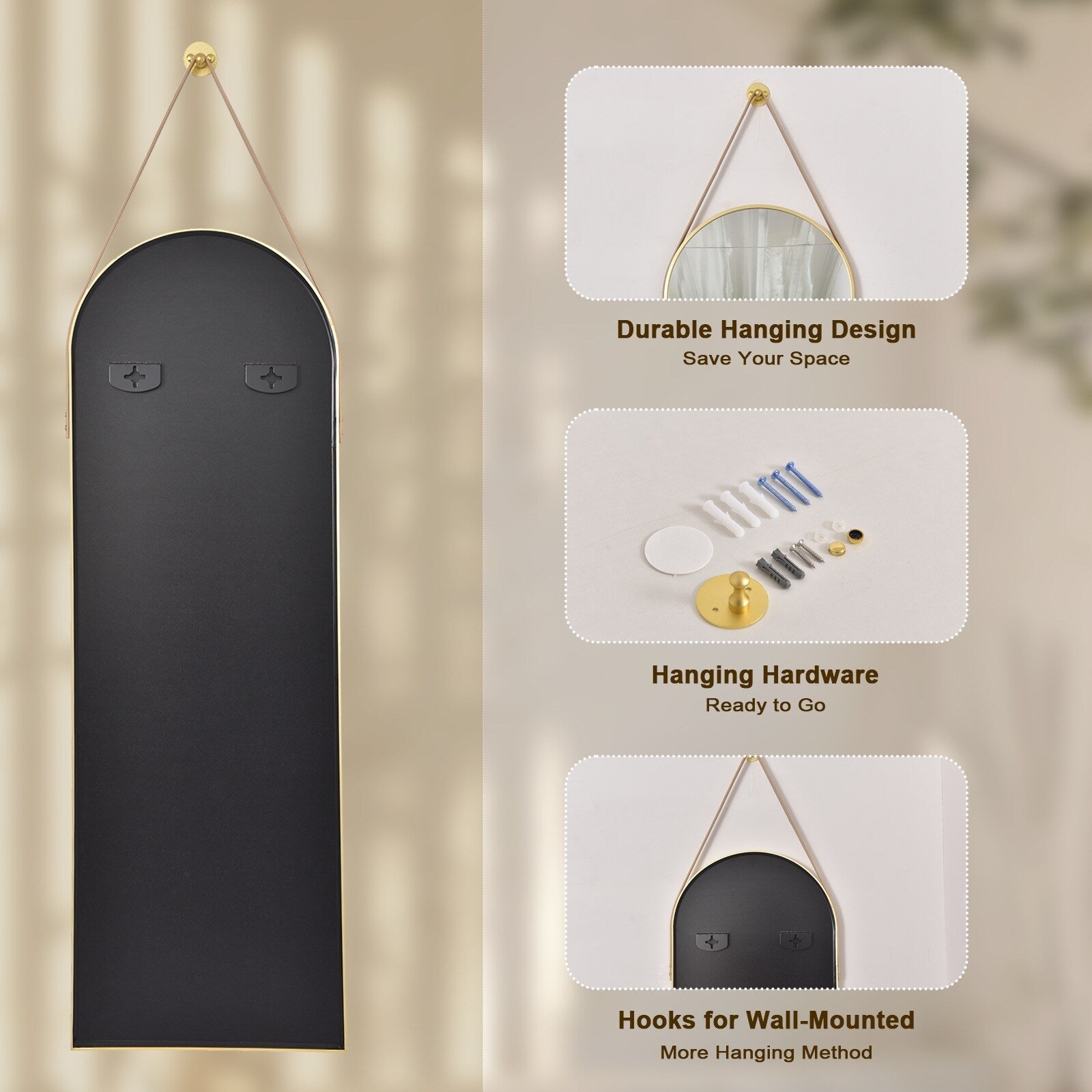 Notre miroir sur pied possède un design unique et est suspendu par une sangle. Fabriqué en alliage d'aluminium et en cuir de haute qualité, il est à la fois stable et durable. Il sert non seulement de miroir, mais constitue également un bel élément de décoration murale.