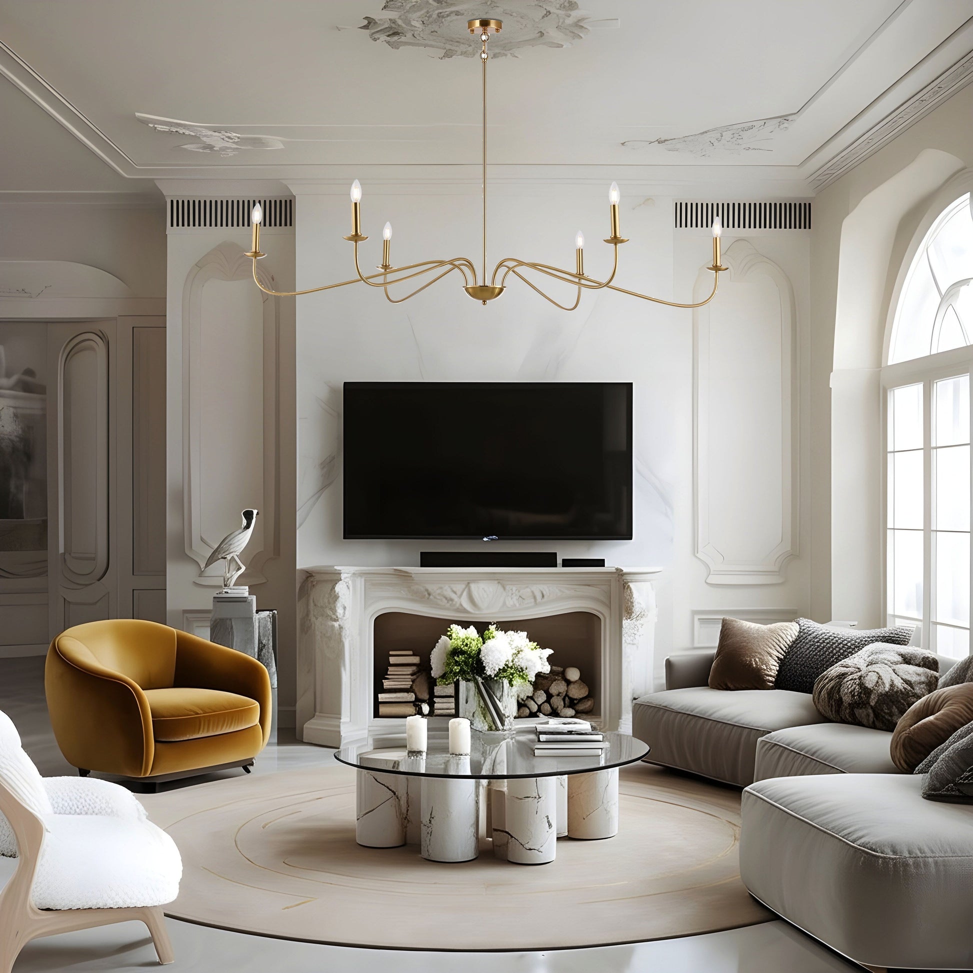 Lustre minimaliste à 6 lumières de 64 pouces, noir mat, or et chrome - N/A