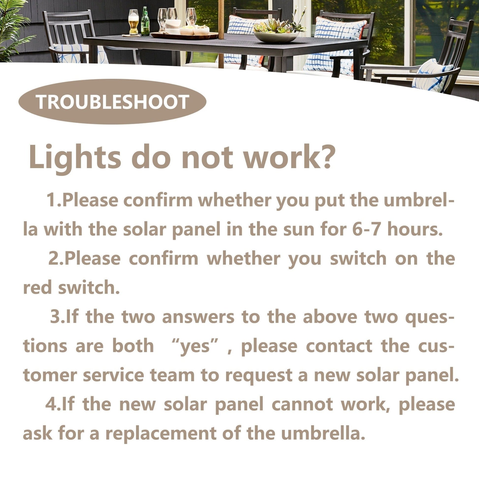 1. Le panneau solaire nécessite 6 à 7 heures d'exposition au soleil pour se charger complètement. Si les lumières ne fonctionnent pas, veuillez recharger complètement le panneau avant de réessayer. Un interrupteur permet d'allumer et d'éteindre les lumières.