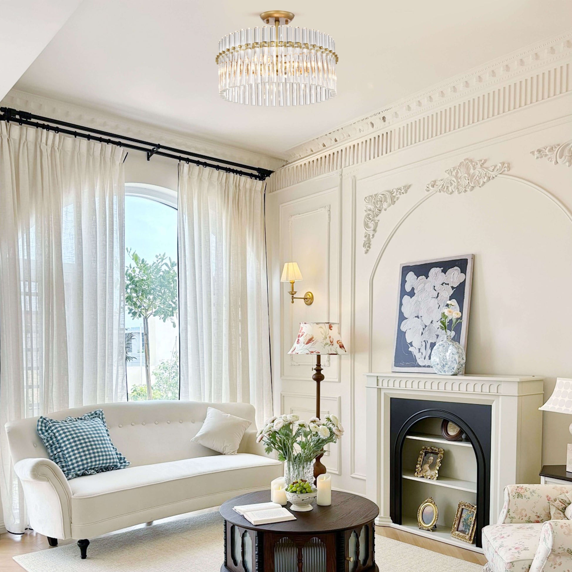 Ce plafonnier à 4 lumières allie modernité et luxe. Son cache-piton rond et son anneau sont en métal finition laiton brossé. Un anneau soutient les tiges de cristal, apportant une touche glamour à votre espace de vie. Les quatre ampoules candélabres de 60 W (vendues séparément) sont à peine visibles et diffusent une lumière subtilement reflétée par les cristaux scintillants. Compatible avec les LED, ce plafonnier est conçu pour les endroits secs et humides, vous permettant ainsi de l'installer pratiquement partout.