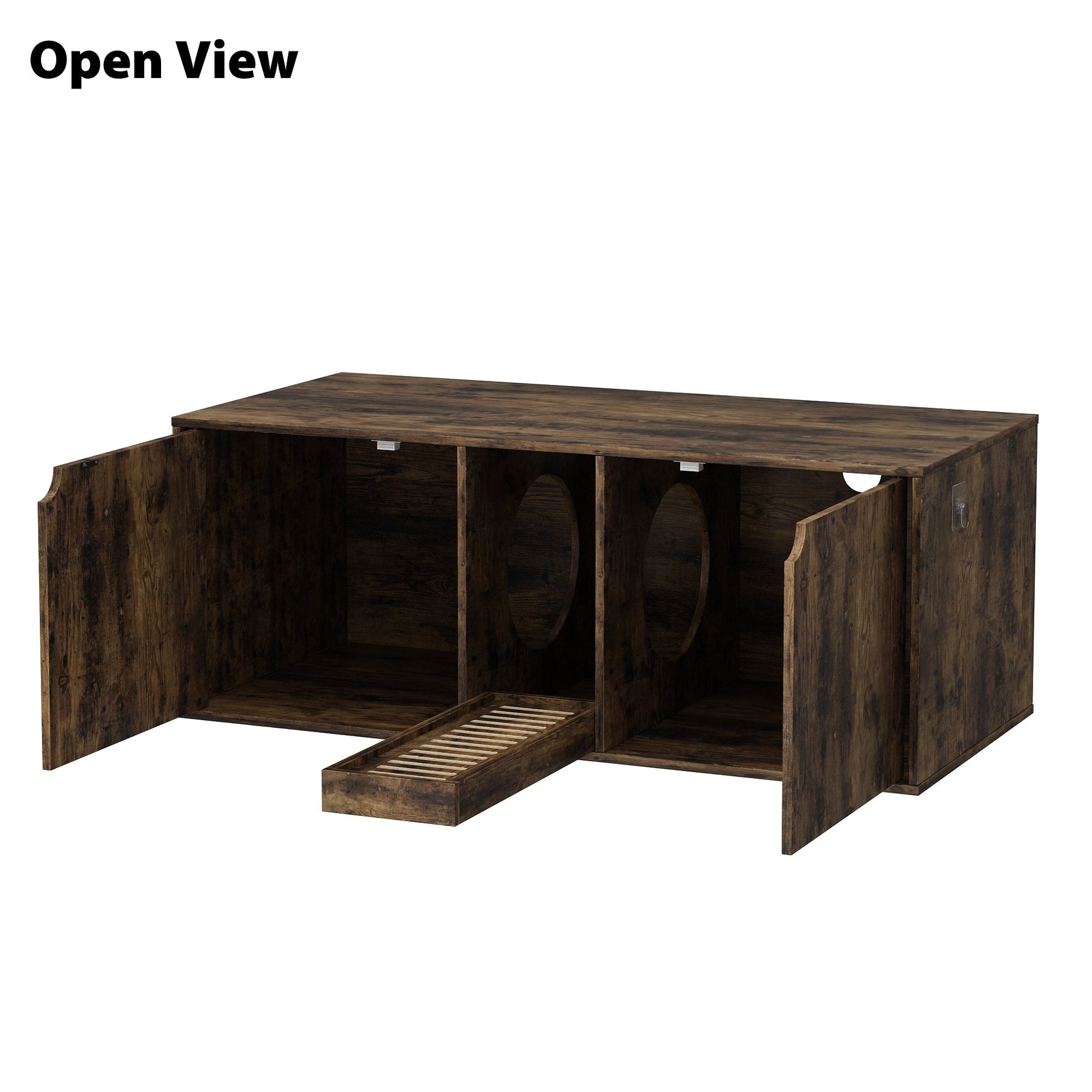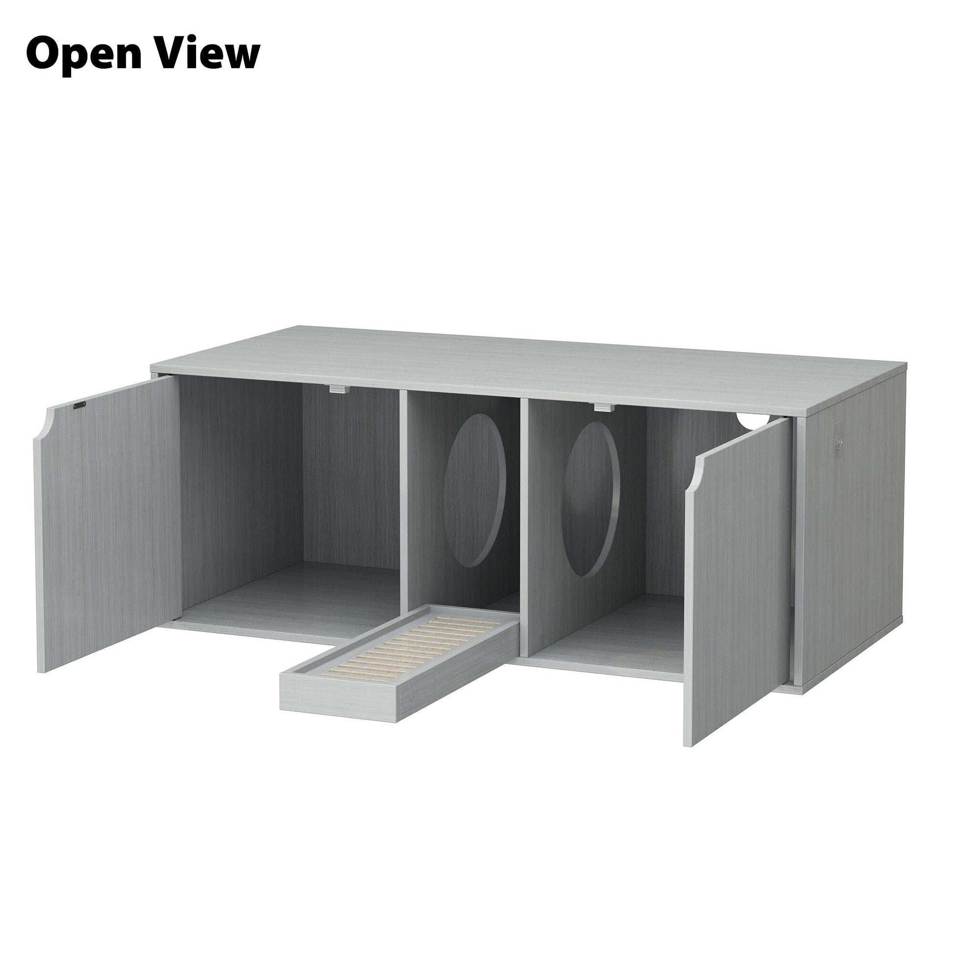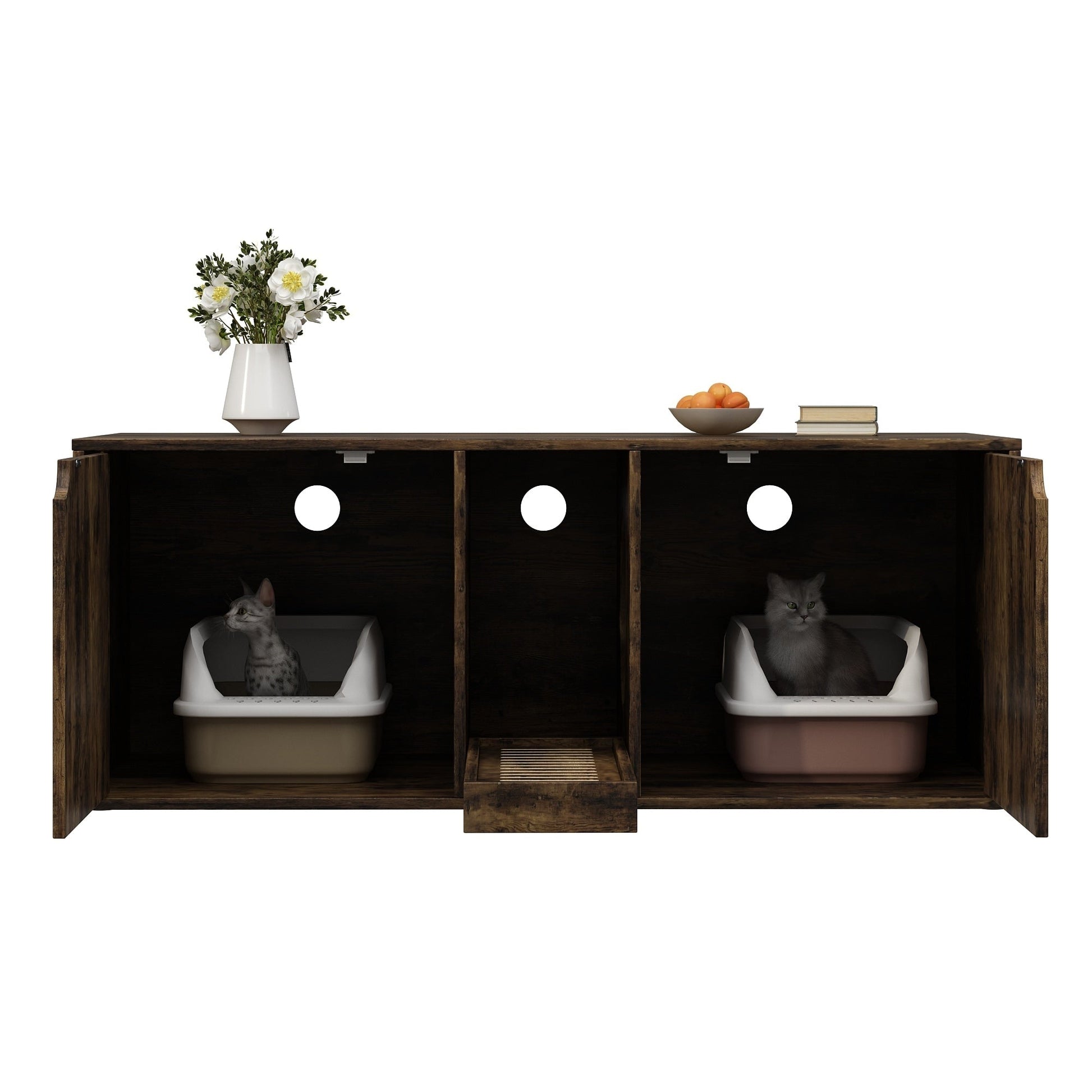 ● Notre meuble pour chats est très spacieux et conçu pour accueillir deux bacs à litière. Il est doté d'une double porte, offrant ainsi à chaque chat son propre espace et son intimité. Un couloir central est prévu pour recueillir la litière, permettant aux chats de s'essuyer les pattes en sortant.
