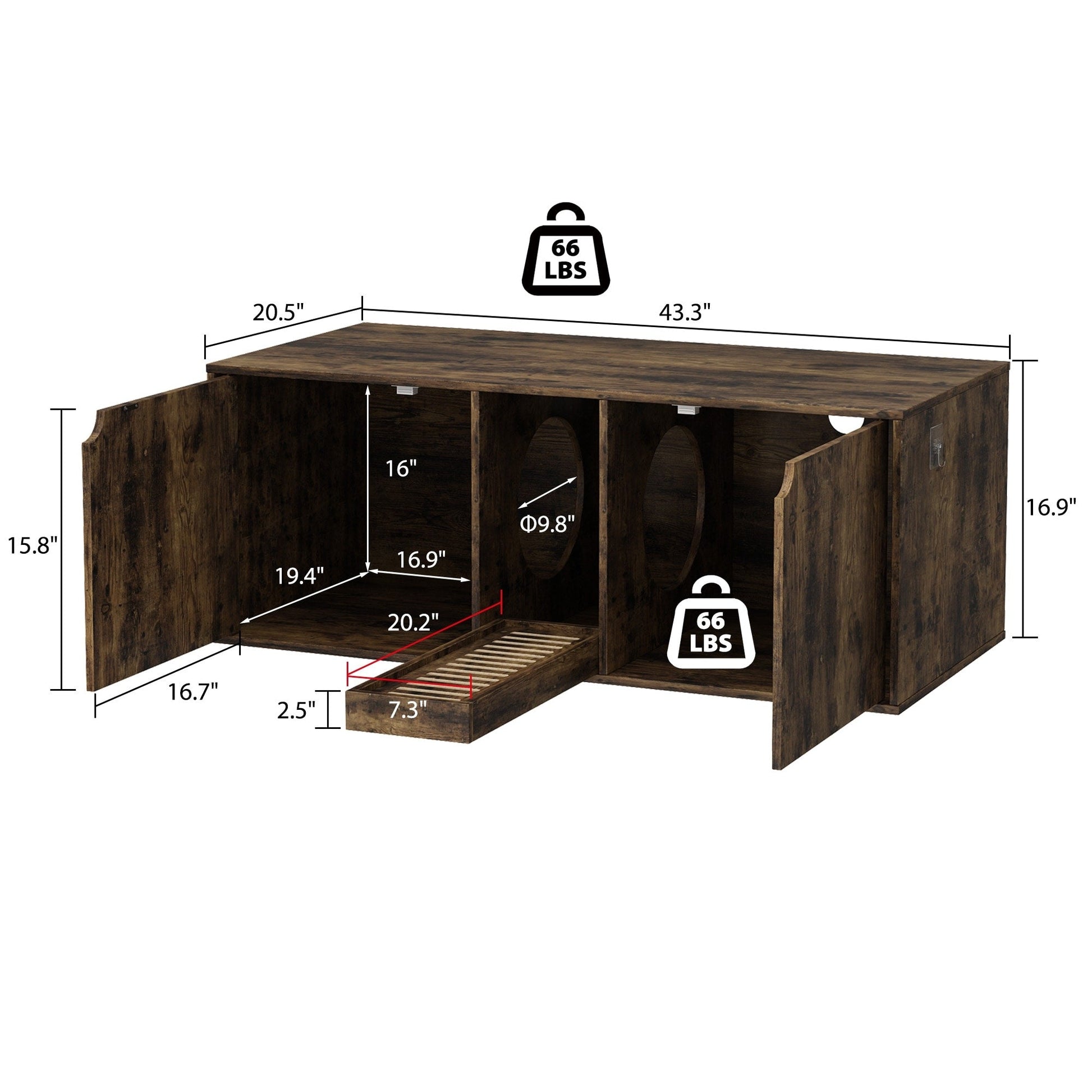 ●L'espace intérieur de l'enclos pour bac à litière pour chat mesure 16,9' x 19,4' x 16'', convient à la plupart des bacs à litière pour chat, et la capacité de poids de notre meuble pour bac à litière caché est de 165 lb, robuste et vous pouvez même vous asseoir dessus.