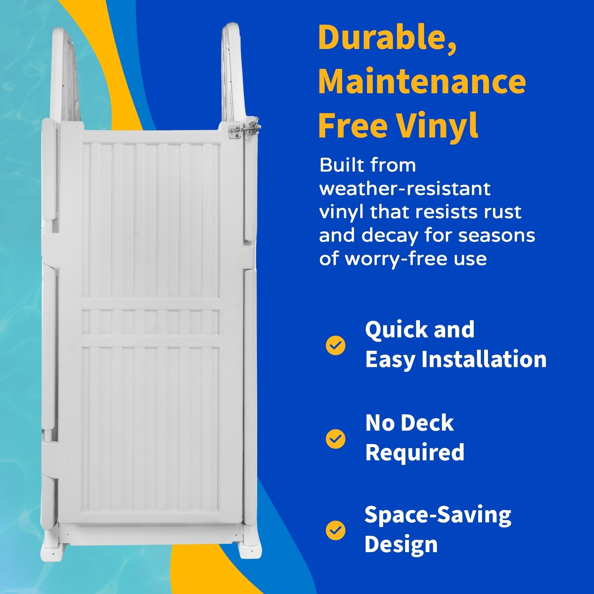 Le système d'accès Easy Pool Step avec portillon comprend deux marches complètes, facilitant et sécurisant l'accès à votre piscine hors-sol. Fabriqué en vinyle résistant à la corrosion, ce système d'accès à 4 marches offre une inclinaison progressive, le rendant plus accessible que les échelles de piscine standard. Les doubles mains courantes robustes et les marches antidérapantes garantissent une utilisation sans problème. Conçu pour les piscines à parois en acier de 122 à 137 cm, ce système comprend une plateforme qui protège la rampe supérieure de votre piscine. Pour plus de sécurité, le portillon à fermeture et verrouillage automatiques est verrouillable, empêchant l'accès lorsque la piscine n'est pas utilisée. Ce système est conforme à toutes les normes locales relatives aux abris d'échelle et aux systèmes d'accès de piscine et supporte jusqu'à 159 kg. Il est garanti 3 ans.