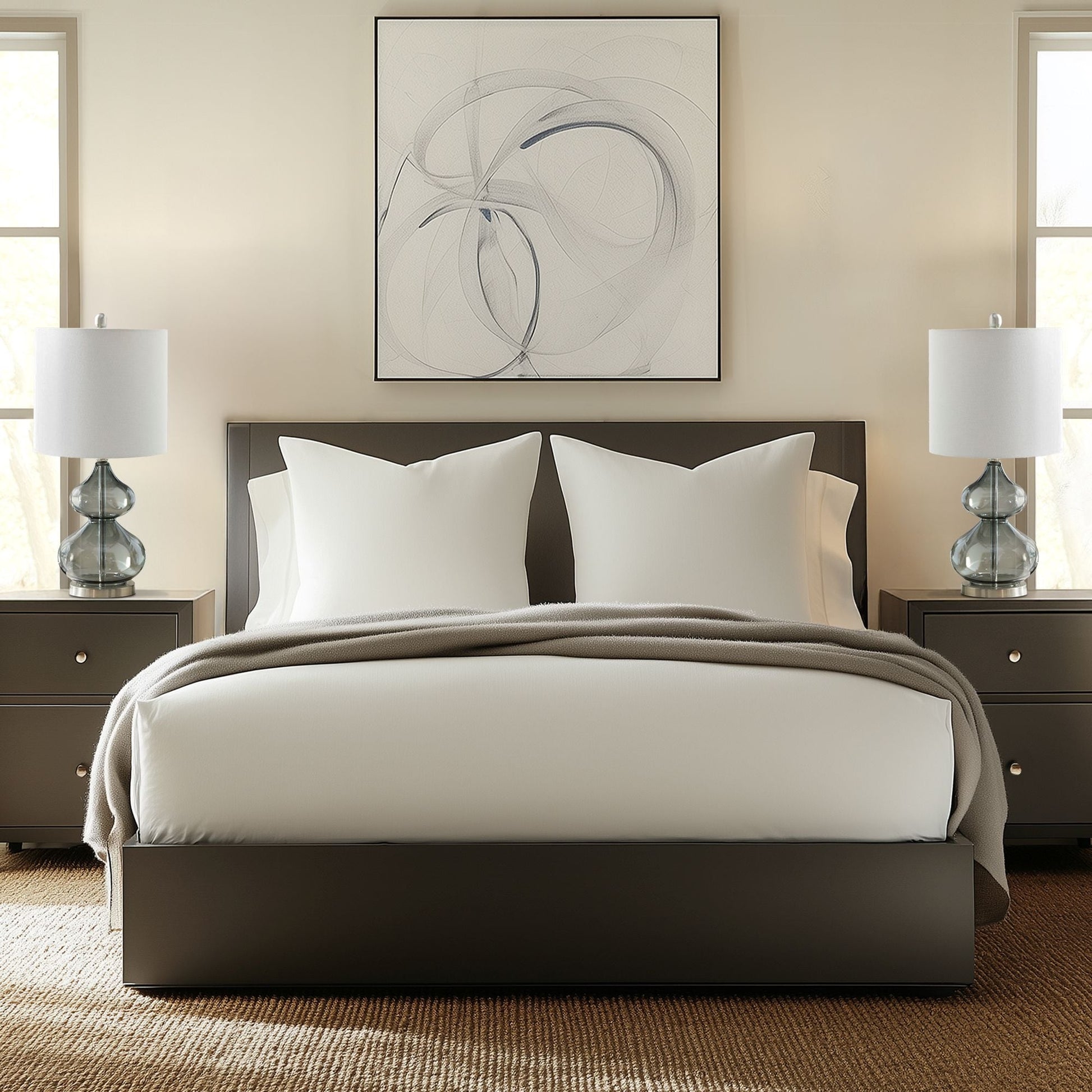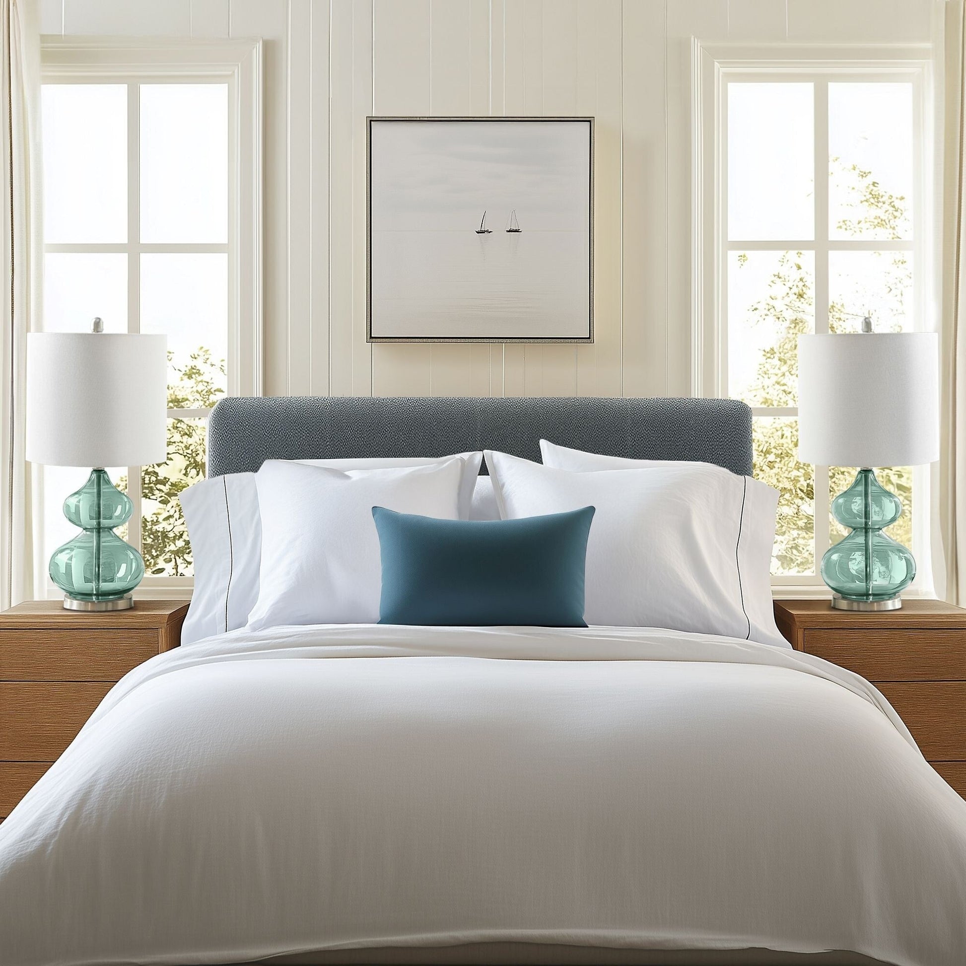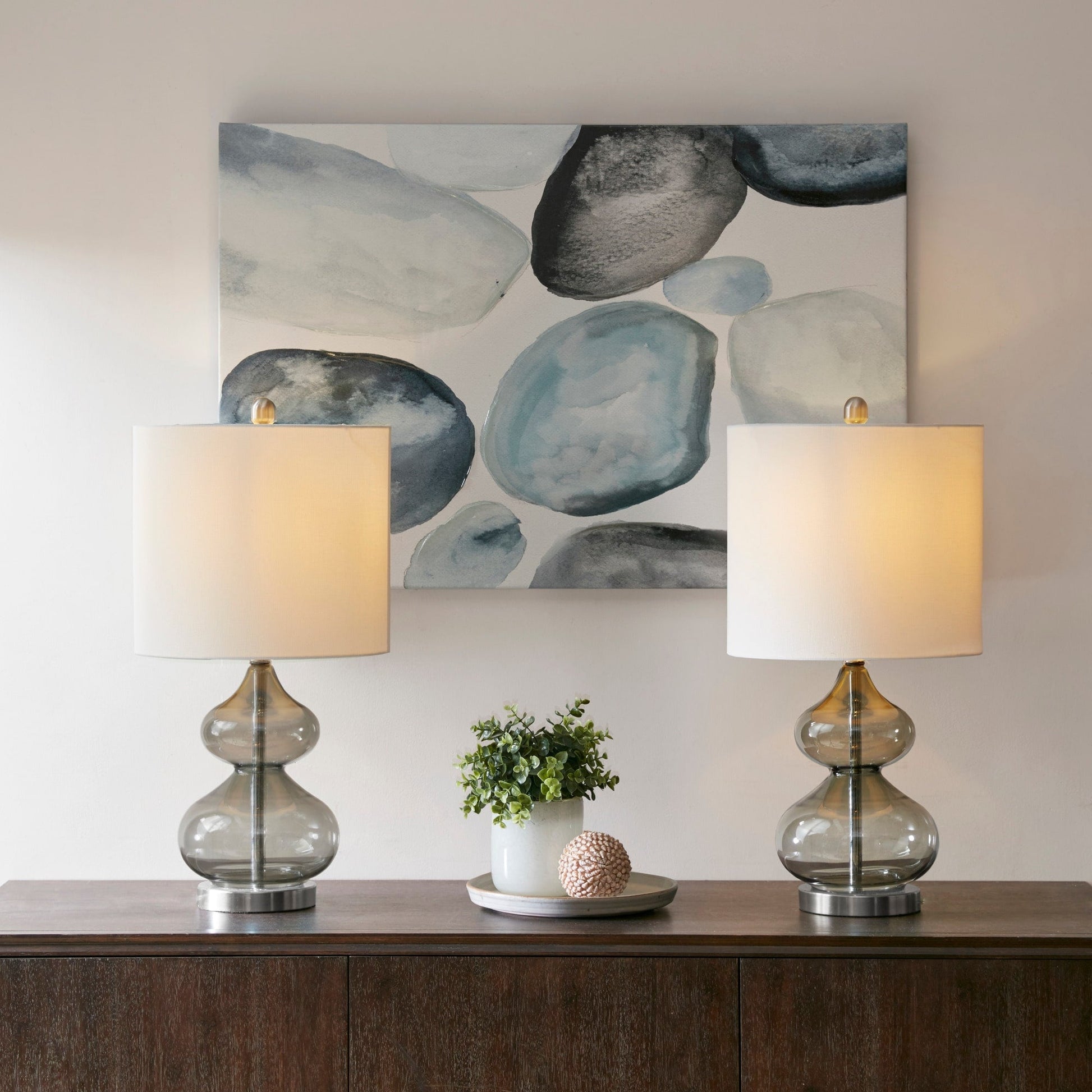 Le duo de lampes de table Ellipse de 510 Design apporte une touche d'élégance moderne à votre intérieur. Ces deux lampes sont composées de deux pieds en verre superposés en forme de gourde, aux surfaces polies et aux accents métalliques dorés brossés. Le verre translucide diffuse une lumière douce et chaleureuse. Chaque lampe est coiffée d'un abat-jour cylindrique en tissu blanc et d'un fleuron en métal doré pour une finition raffinée. Conçues pour une utilisation polyvalente, elles offrent un éclairage vers le haut ou vers le bas et sont fournies avec deux ampoules LED de 9 W à faible consommation. Idéales pour le salon, la chambre ou le bureau. Nettoyage localisé uniquement. Garantie limitée de 2 ans.