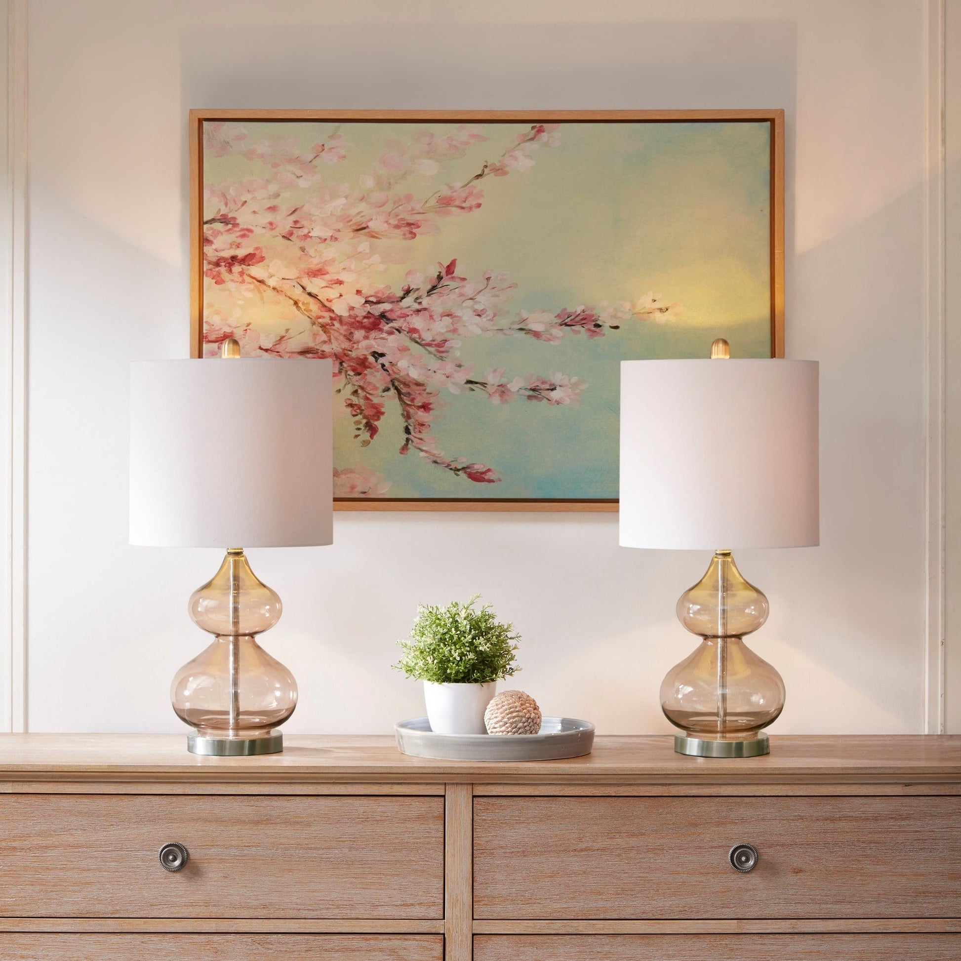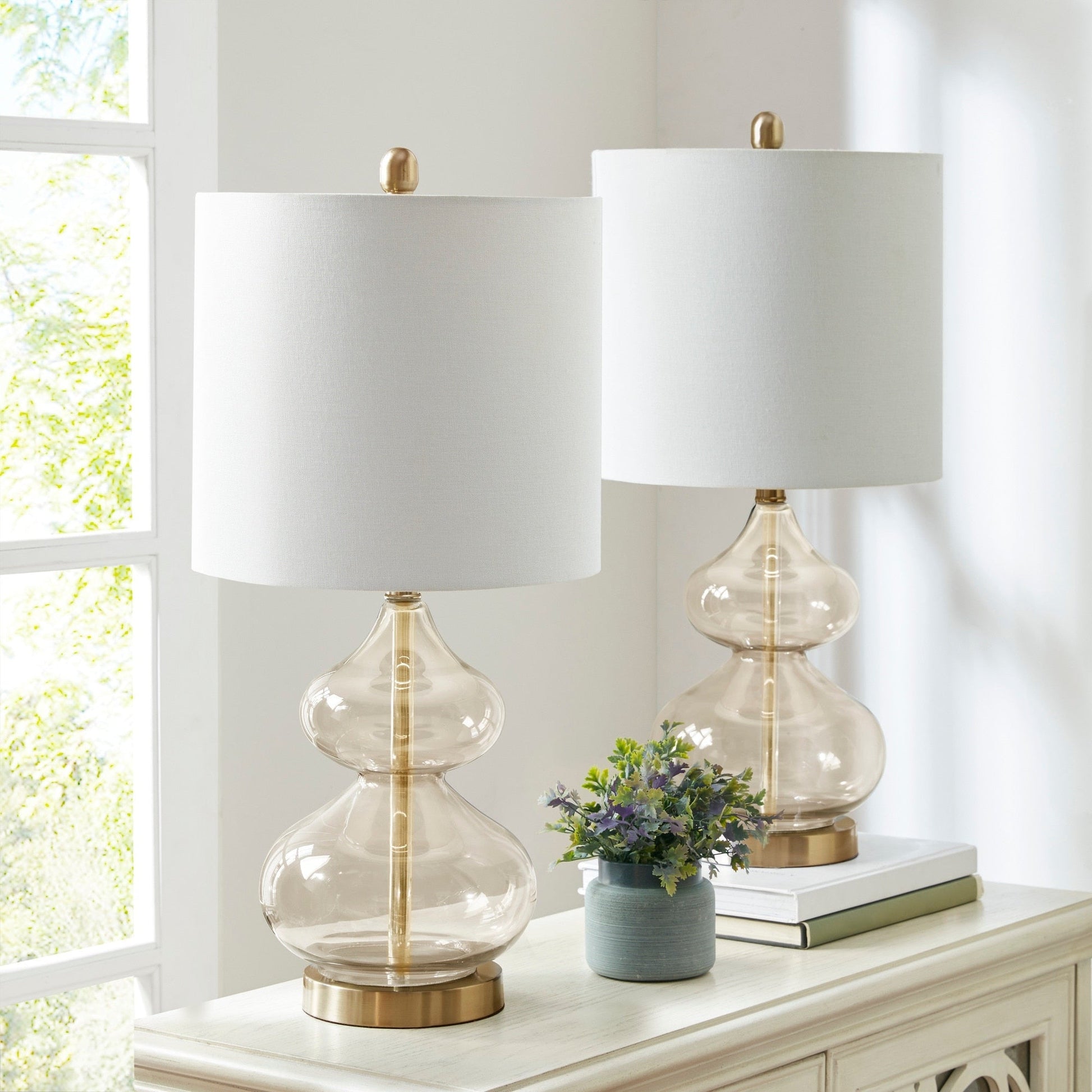 - Ensemble de 2 lampes de table avec un pied en verre à double gradins en forme de gourde, une surface lisse et polie, et des accents en métal doré brossé pour un style élégant et moderne.
