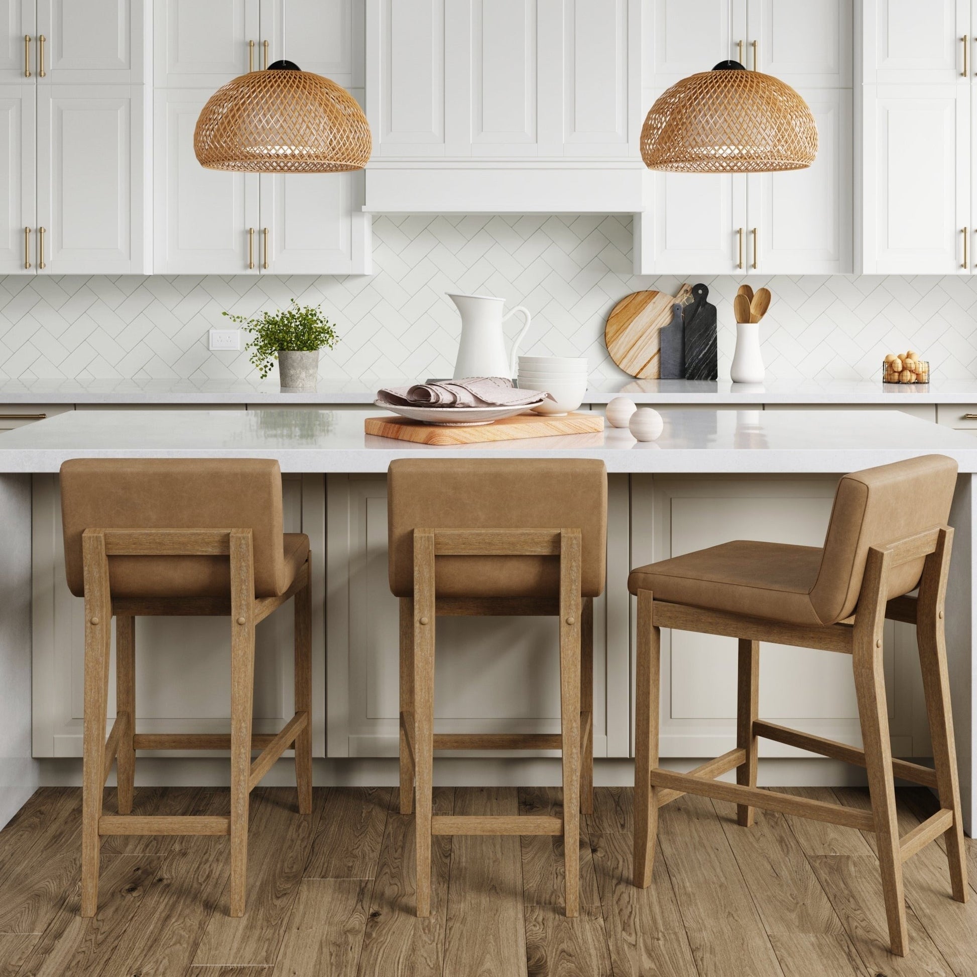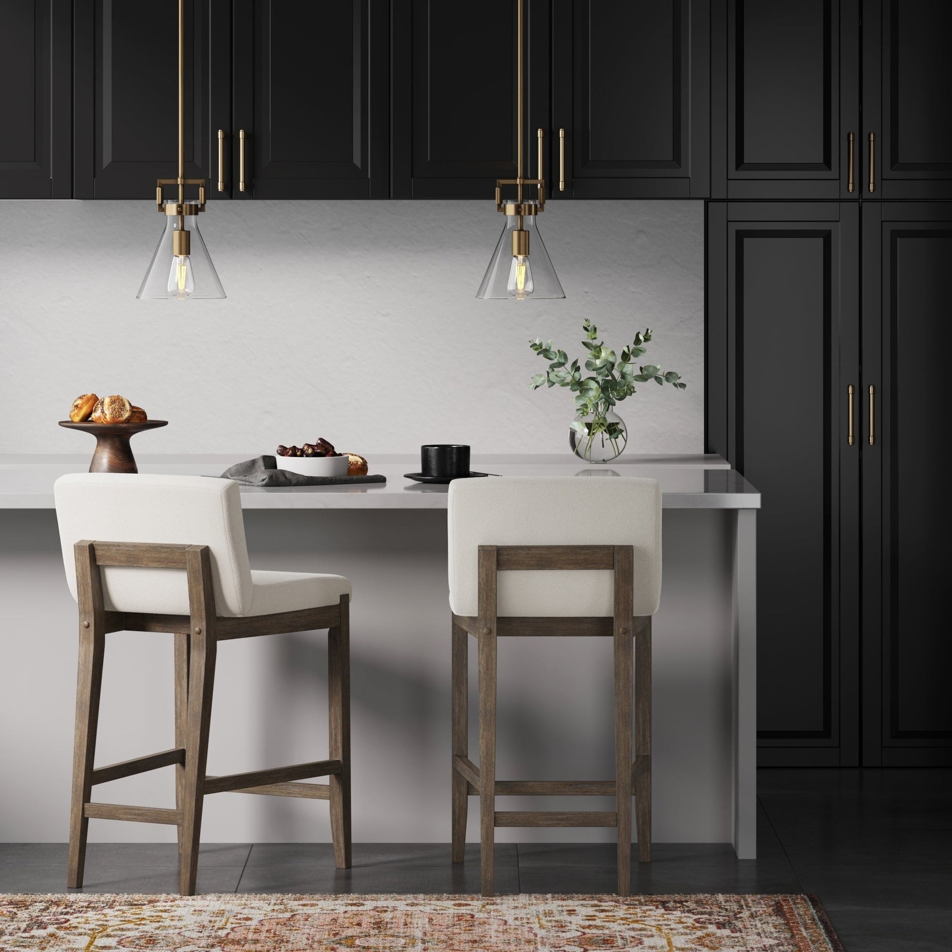 - Gracie présente un revêtement en bois brossé sur ses pieds solides et un revêtement en tissu bouclé ou en similicuir, ce qui en fait un ajout approprié à votre cuisine de style moderne ou de ferme.