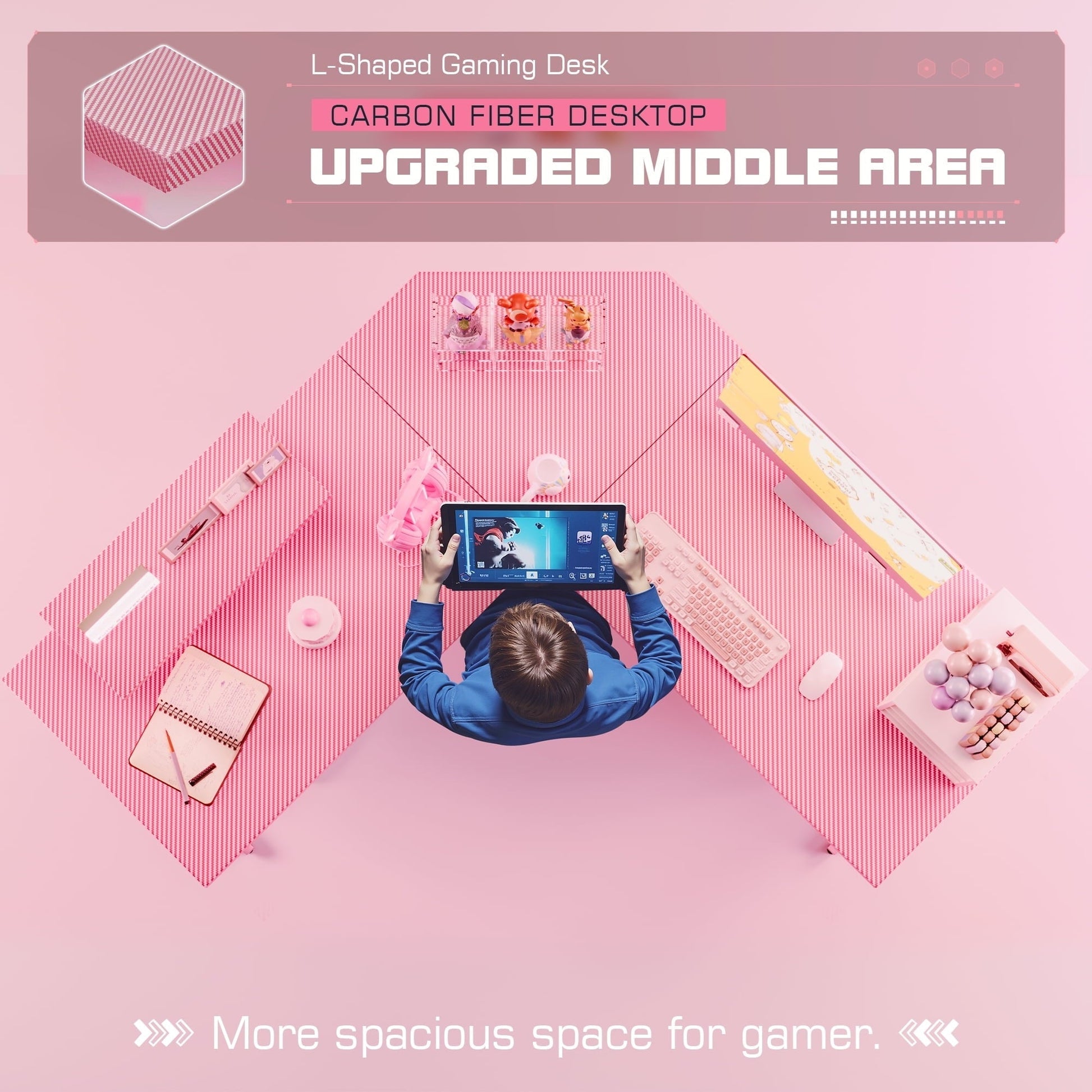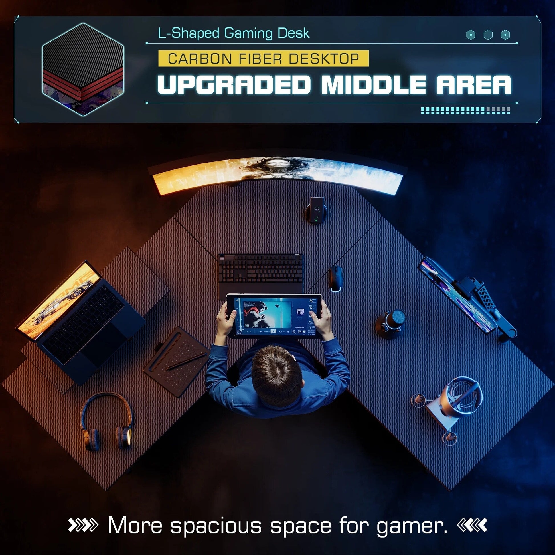 Le bureau gaming et bureau d'angle Homall offre un plateau spacieux et polyvalent. Que ce soit pour jouer ou travailler, vous avez le choix entre des plateaux en fibre de carbone et en bois. Sa forme en L permet d'optimiser l'espace dans un coin. Le grand plateau peut accueillir tous vos appareils électroniques, et le support d'écran amovible peut être installé à gauche ou à droite pour un confort d'utilisation optimal. Profitez d'une expérience de jeu exceptionnelle !
