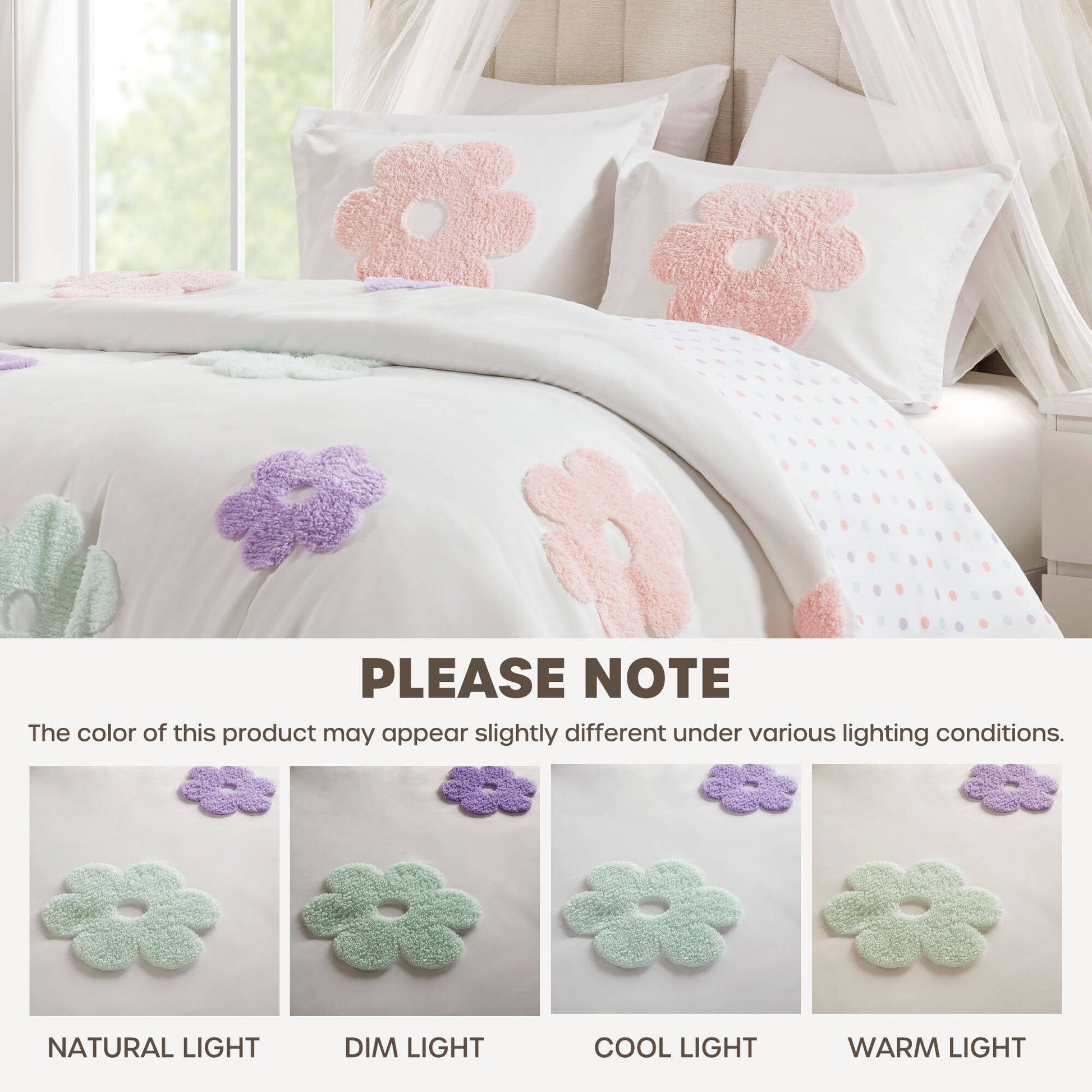 - Housse de couette/Taie d'oreiller : Polyester avec face en chenille tuftée, dos en microfibre