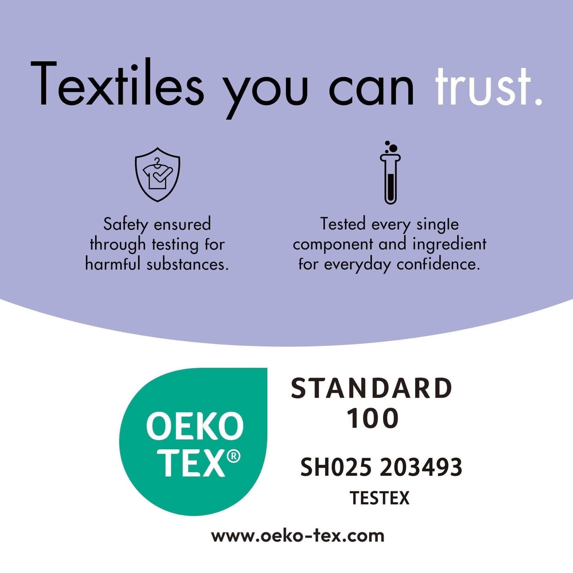 - Textile portant le label OEKO-TEX, certifié sans danger pour la peau.
