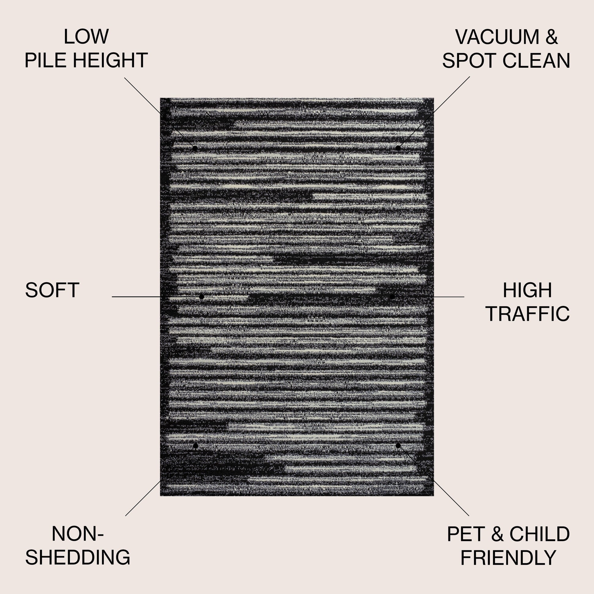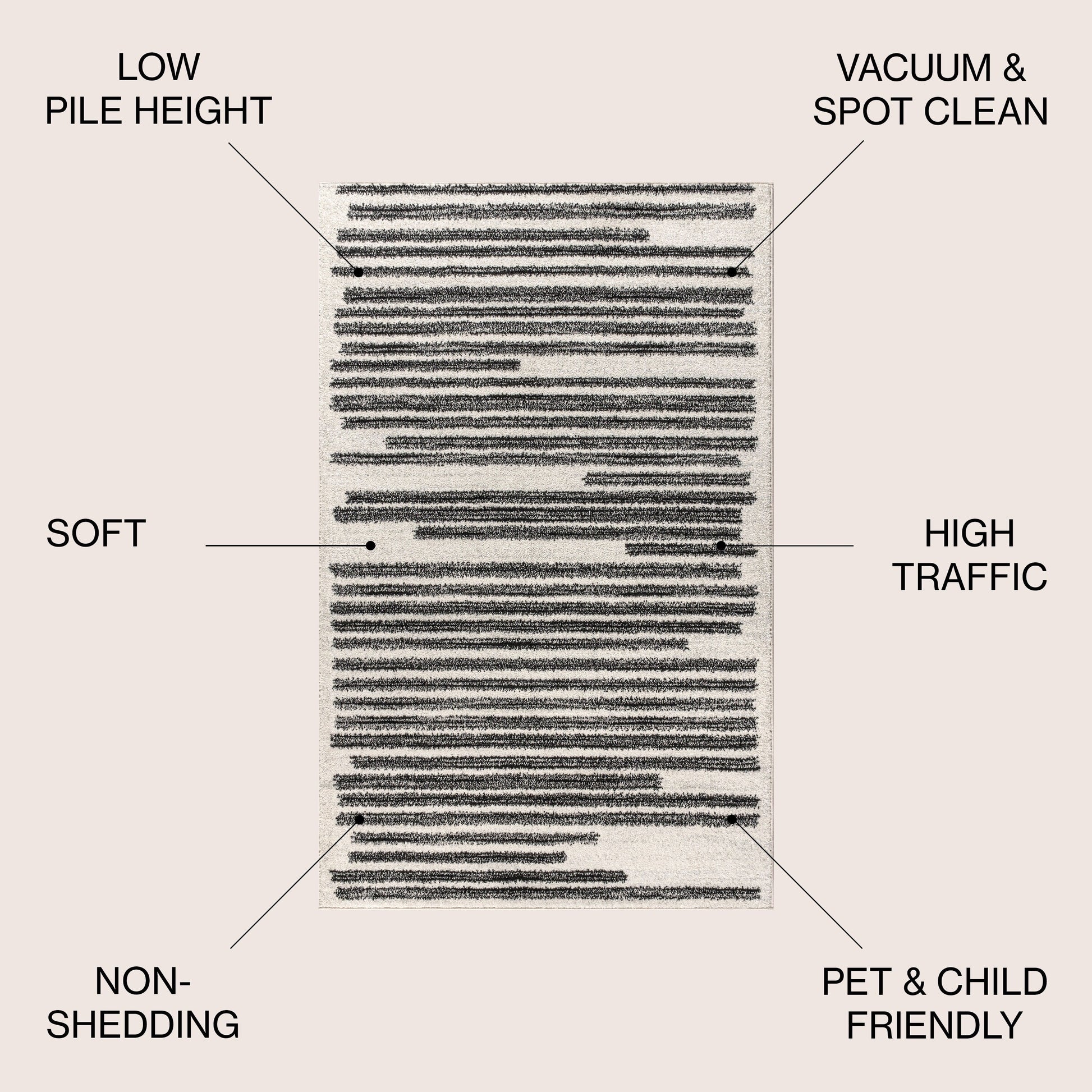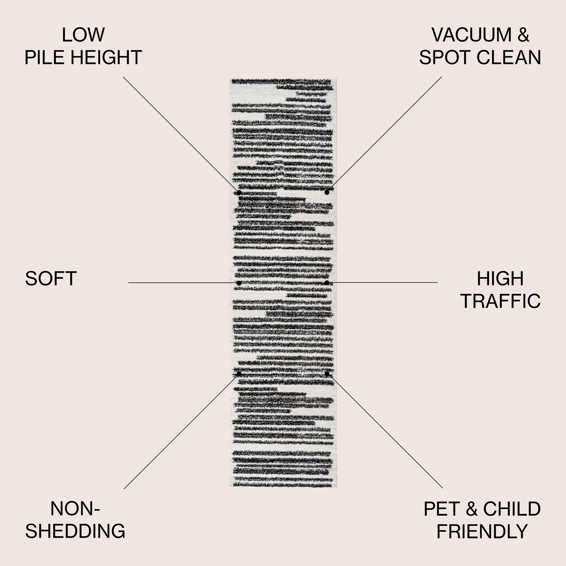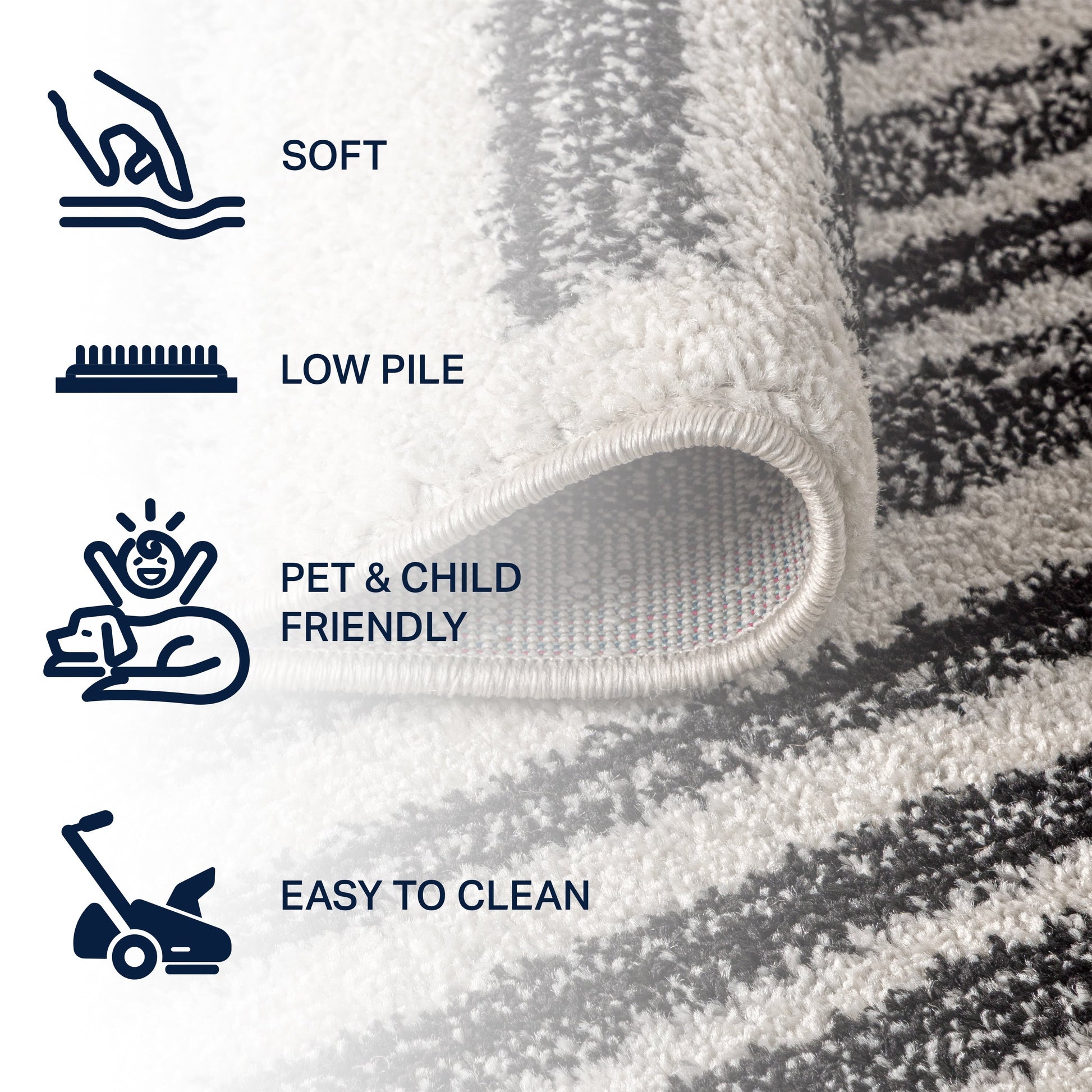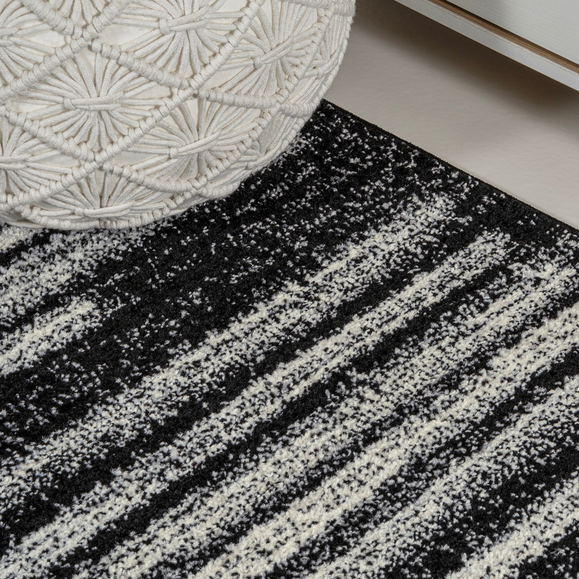 Inspiré des tapis marocains anciens, notre tapis à rayures modernes est tissé mécaniquement et possède un velours court. Les rayures décalées et le motif à barres sont tissés en noir sur un fond ivoire ; le mélange des fils évoque les tapis traditionnels tissés à la main. Apportez une touche vintage à votre intérieur avec ce tapis facile d'entretien.