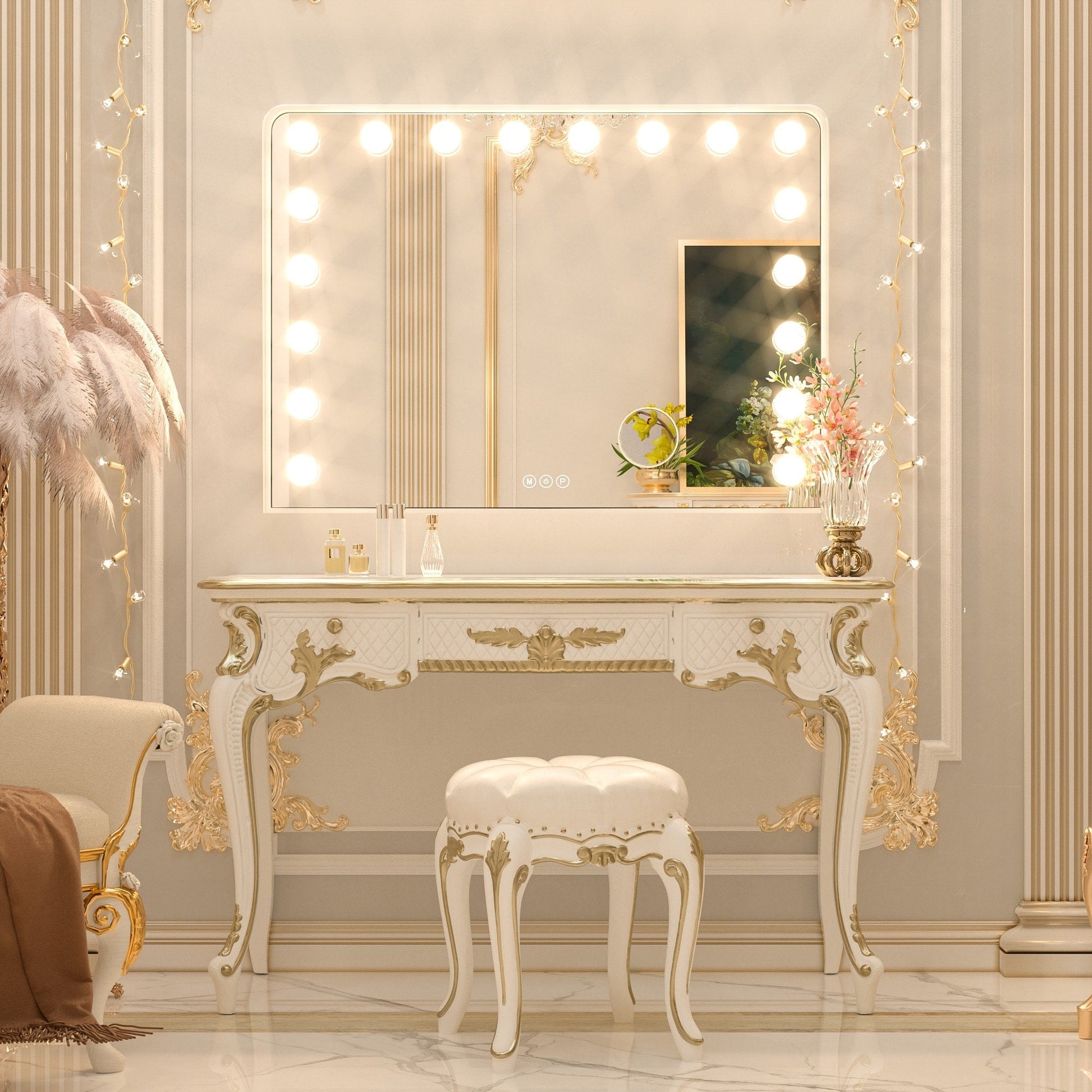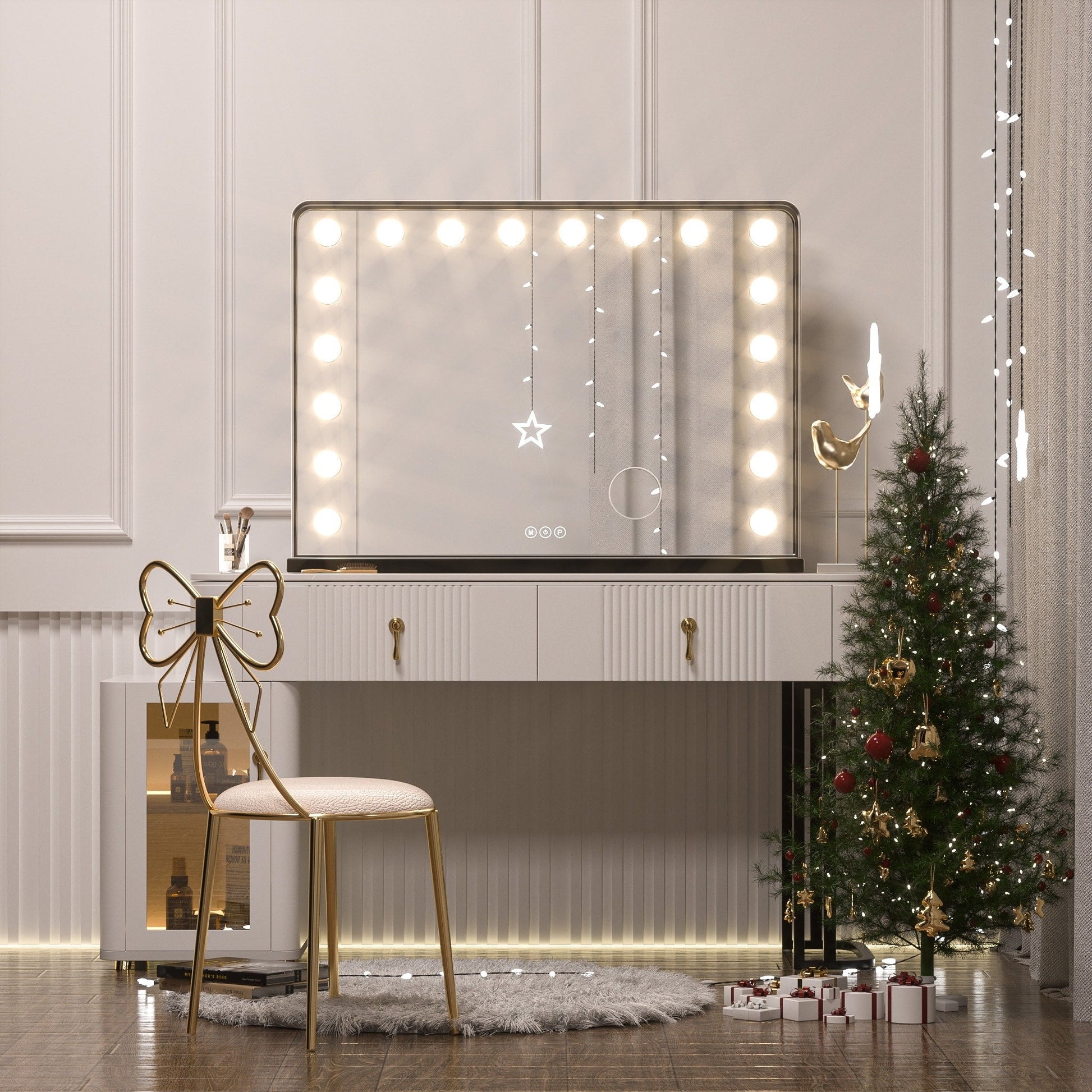 - Deux tailles de miroirs : 15 ampoules (23' x 18') et 18 ampoules (32' x 24')
