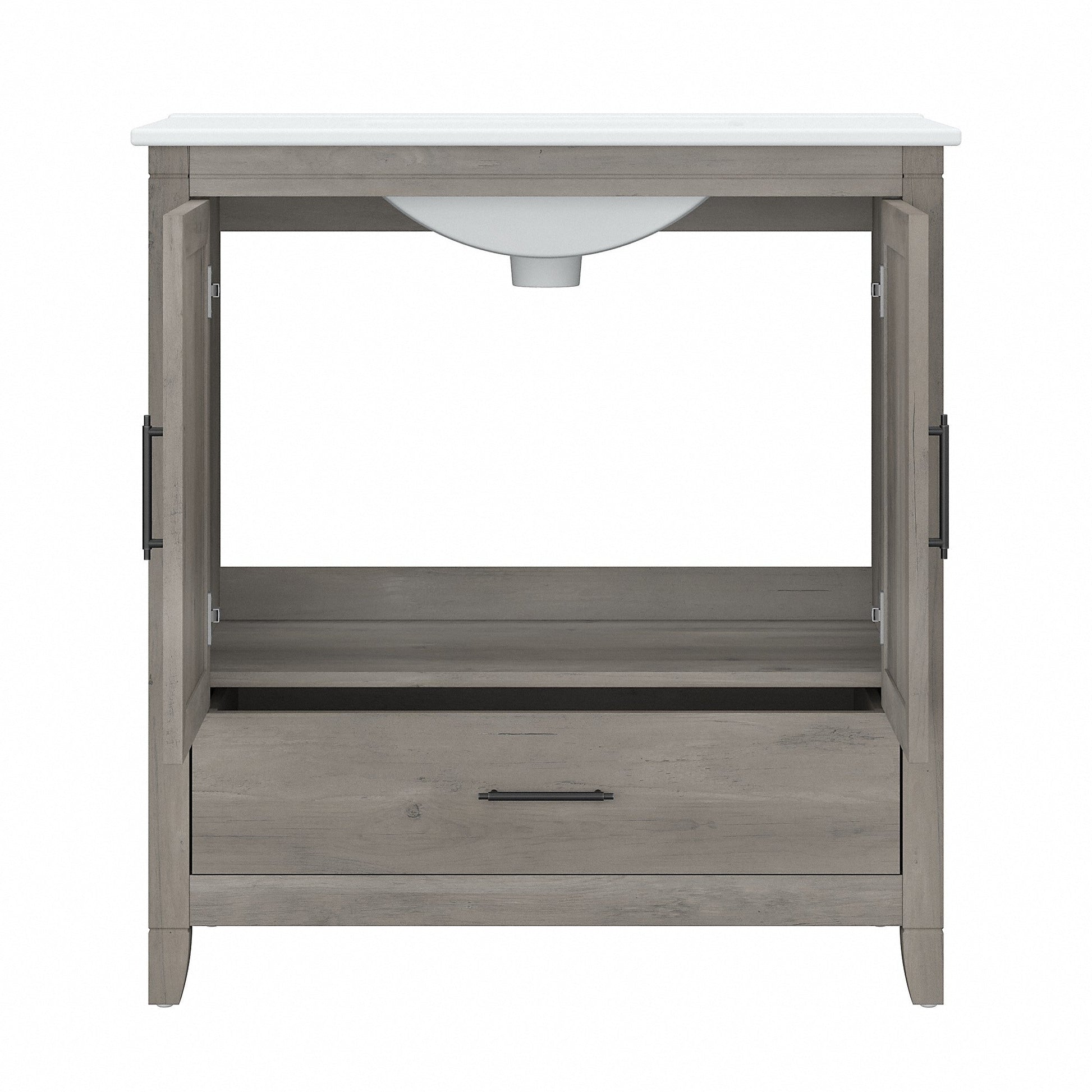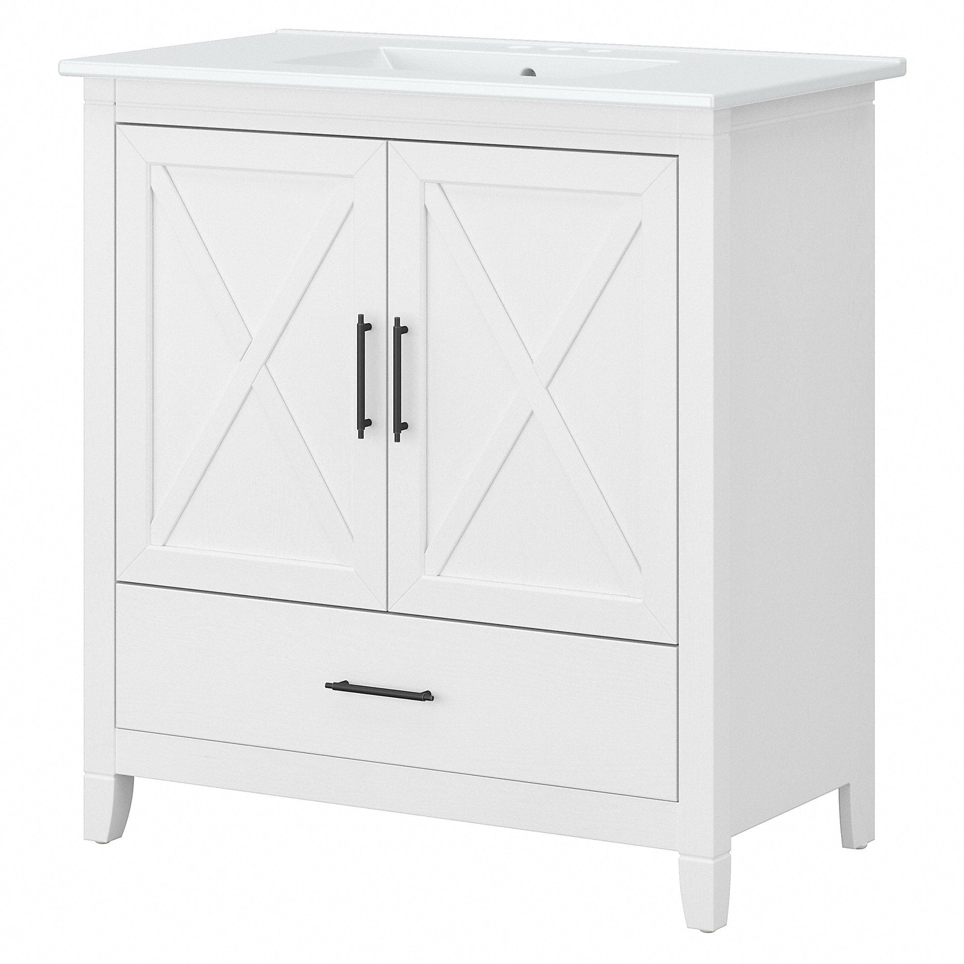 Le meuble-lavabo Key West 32 W de Bush Furniture avec vasque est idéal pour aménager votre intérieur dans un style rustique authentique. Affichant un design décontracté et rafraîchissant, ce meuble-lavabo mural allie esthétique, durabilité et praticité pour des années d'utilisation sans problème. Le lavabo est doté de trois trous pré-percés pour un robinet à entraxe de 10 cm (robinets non inclus), d'un trop-plein et d'une bonde de 4,4 cm. La vasque en céramique blanche se nettoie rapidement et facilement avec une éponge douce, de l'eau et du détergent. Profitez d'un tiroir et d'un meuble de rangement intégrés pour ranger produits d'entretien, serviettes, articles de toilette et autres produits de toilette essentiels et les rendre facilement accessibles. Les portes de l'armoire sont dotées de charnières lisses de style européen et d'un motif en X unique, qui s'harmonise parfaitement avec les finitions gris bois flotté vieilli et frêne blanc de votre choix. Bénéficiant de la garantie fabricant Bush Furniture d'un an, ce petit meuble-lavabo a été rigoureusement testé pour sa sécurité, sa durabilité et ses performances. Son lavabo à encastrer est conforme aux normes UPC et CSA B45.1 pour les appareils sanitaires en céramique. Assemblage et installation requis. Découvrez la collection complète de meubles de salle de bain style campagnard Key West et adaptez-les à vos besoins grâce à une armoire à pharmacie, une armoire murale, un meuble de rangement au-dessus des toilettes, un meuble de rangement haut pour salle de bain et un panier à linge avec couvercle et doublure amovible (articles assortis vendus séparément).