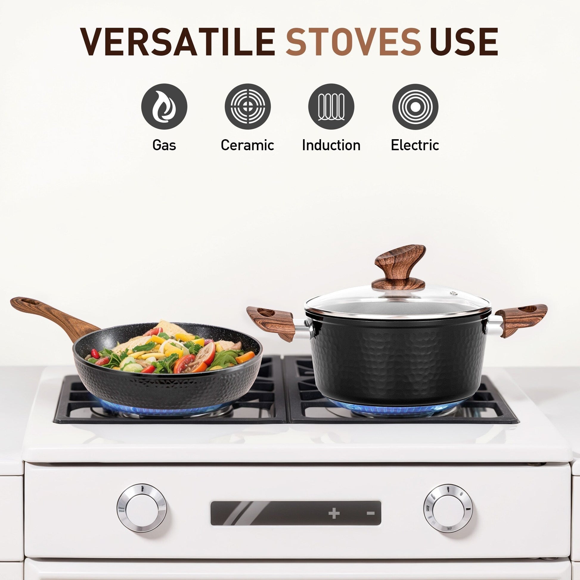- L'ensemble comprend des poêles à frire de 8,15 pouces et 9,75 pouces, des casseroles de 1,5 pinte et 3 pintes avec couvercles, des cocottes de 3 pintes et 5 pintes avec couvercles et 5 ustensiles en nylon