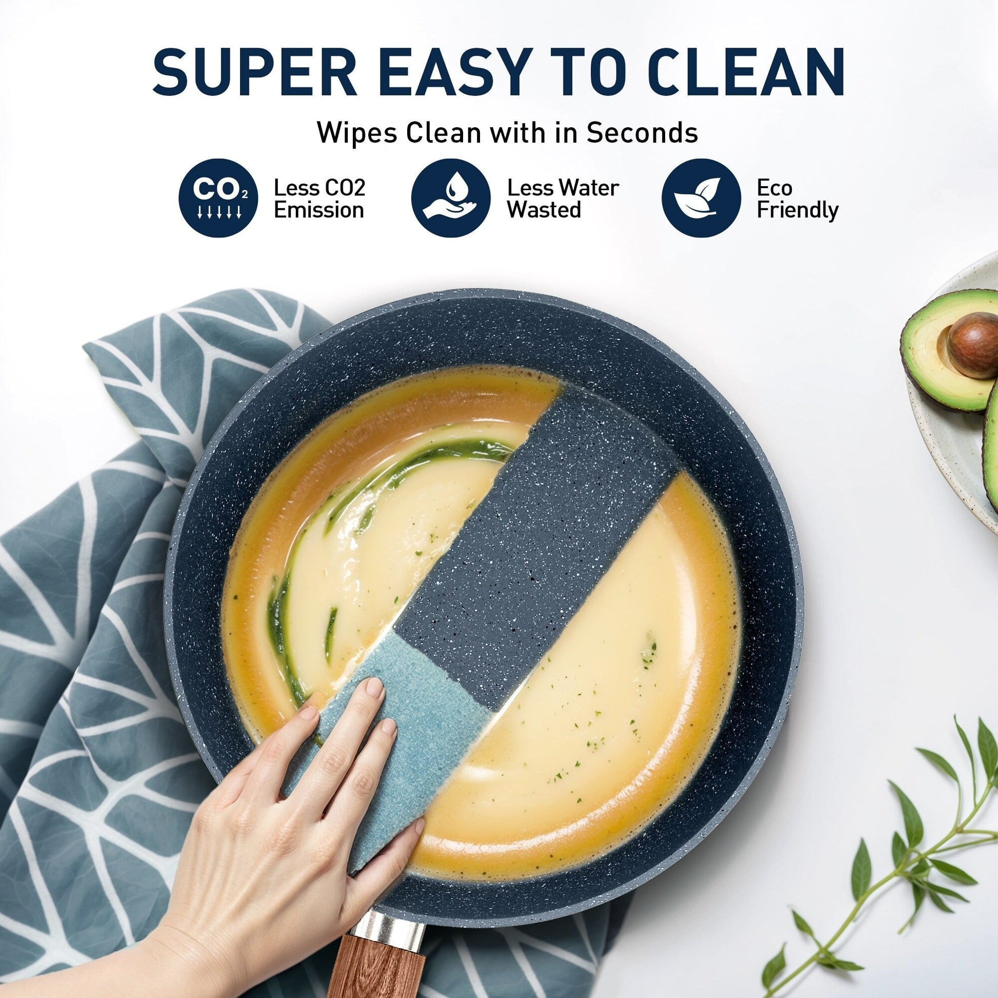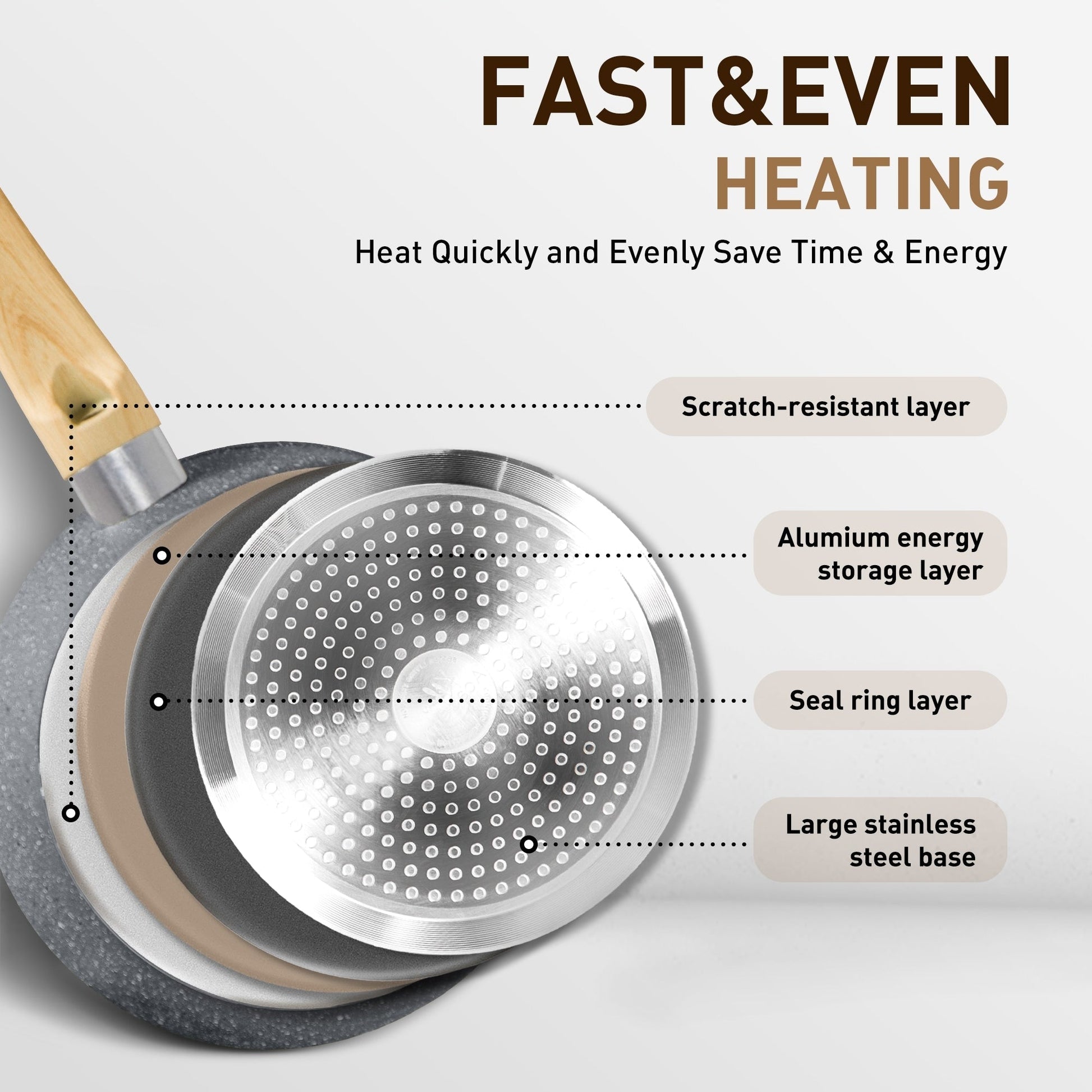 Préparez des plats savoureux avec la batterie de cuisine antiadhésive avec revêtement en granit Kitchen Academy. Chaque pièce est dotée d'un fond en aluminium forgé pour une cuisson uniforme sur tous les feux, y compris l'induction. L'extérieur en granit alimentaire triple couche offre une durabilité et une résistance exceptionnelles à la déformation, tandis que l'intérieur recouvert de marbre naturel facilite la cuisson et le nettoyage. Les poignées en bakélite aspect bois apportent une touche d'élégance à cet ensemble polyvalent.
