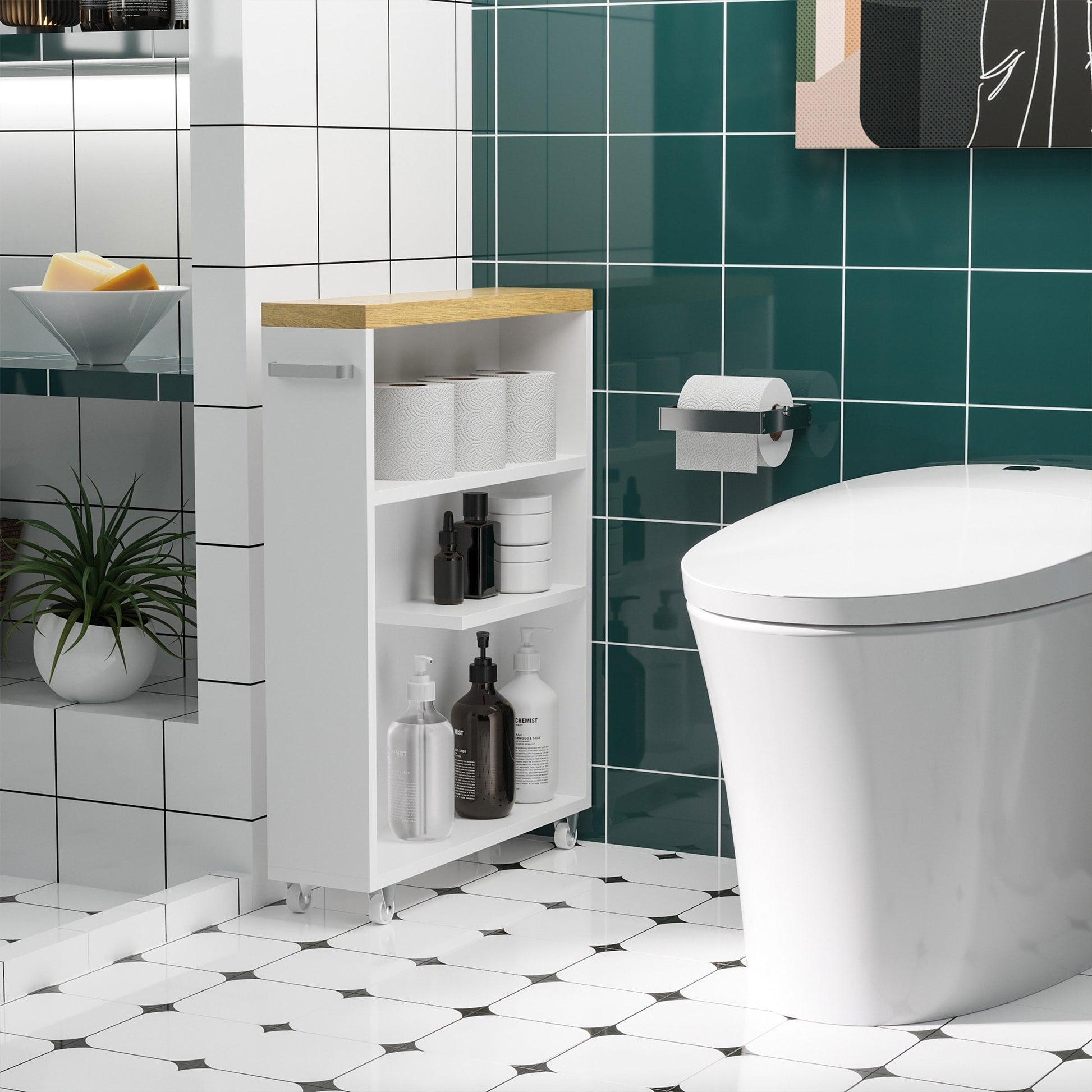 Meuble de salle de bain Kleankin Slim avec roulettes, rangement intégré et étagères en bois, idéal pour les petits espaces, blanc.