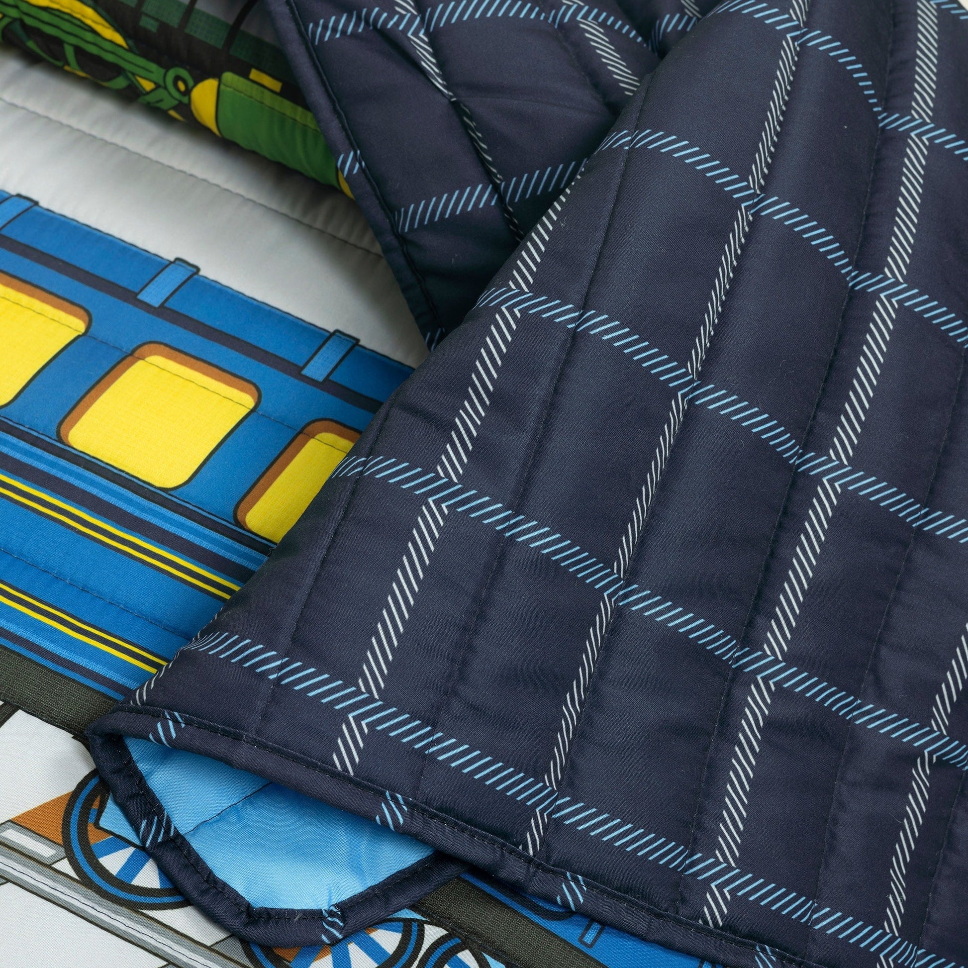 Tous à bord ! Votre enfant adorera être le conducteur de ce voyage en train grâce à notre parure de lit réversible « Trains à vapeur ». Ce motif coloré représente trois locomotives à vapeur vintage filant sur les rails. Les jolis trains imprimés contrastent avec le motif quadrillé du revers, offrant ainsi de multiples possibilités de décoration. Stimulez l'imagination et la créativité de votre enfant avec cette parure de lit réversible sur le thème des locomotives à vapeur. Deux styles en un ! Retournez simplement la parure pour révéler un motif quadrillé bleu foncé. La couette légère et respirante assure le confort de votre enfant en toute saison. Cette parure comprend une couette et des taies d'oreiller standard. Douce et respirante, cette parure en microfibre est idéale pour les enfants qui ont chaud la nuit et constitue une excellente couche supplémentaire pour ceux qui ont froid. Cette parure est certifiée STANDARD 100 by OEKO-TEX®, ce qui signifie que le tissu, les teintures et tous les composants ont été testés par un laboratoire indépendant et certifiés exempts de plus de 350 substances nocives. L'entretien de la parure de lit réversible « Trains à vapeur » est simple : lavez-la en machine à froid, cycle délicat, et séchez-la à basse température pour la rafraîchir. Veuillez consulter l'étiquette pour les instructions d'entretien complètes.