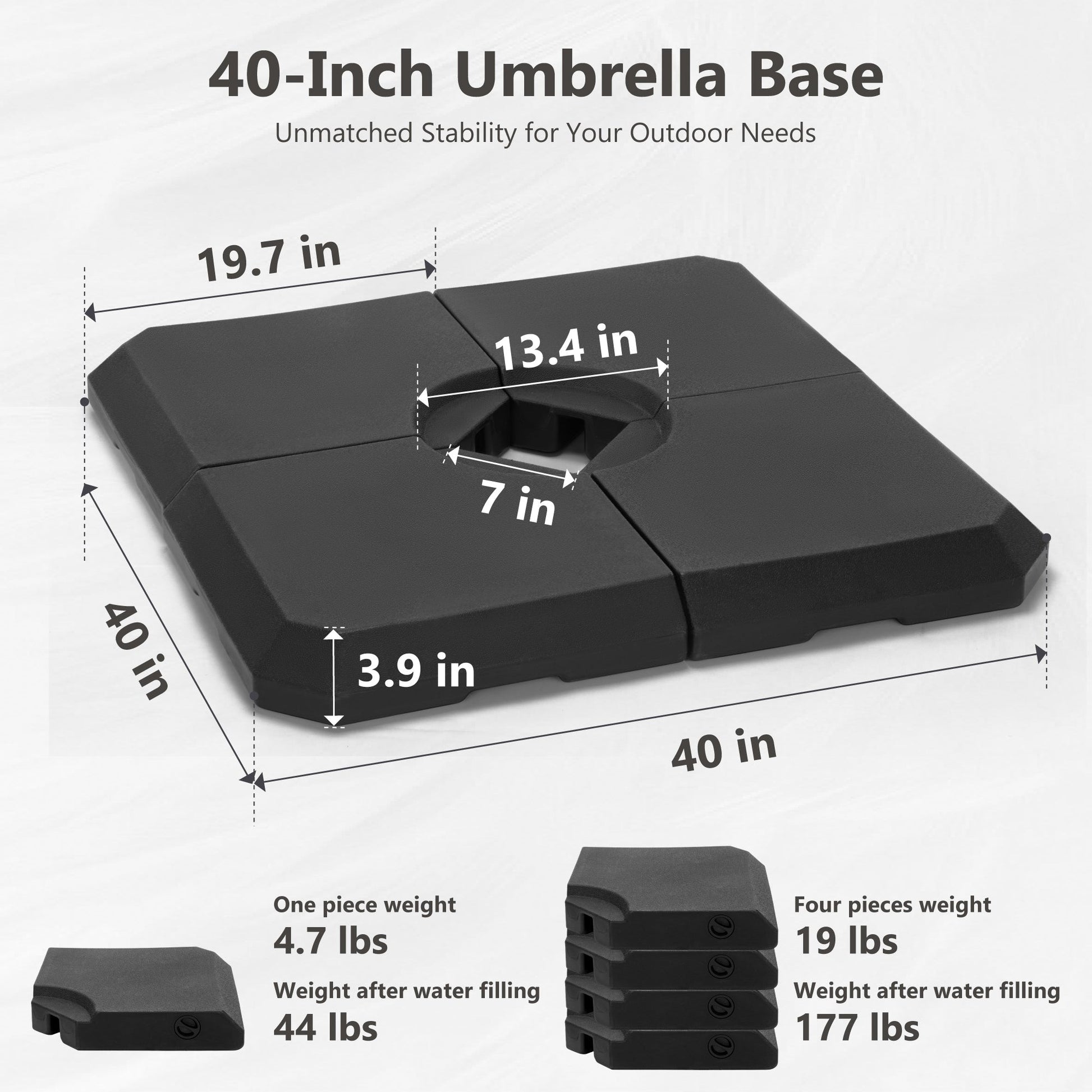 Remarque : Pour le poids, nous recommandons un socle en 4 parties d'au moins 30 kg chacune, pour un total de 120 kg. Pour votre sécurité et éviter tout dommage inutile, veuillez maintenir le parasol fermé et sécurisé lorsqu'il est exposé à un vent fort ou lorsqu'il n'est pas utilisé.