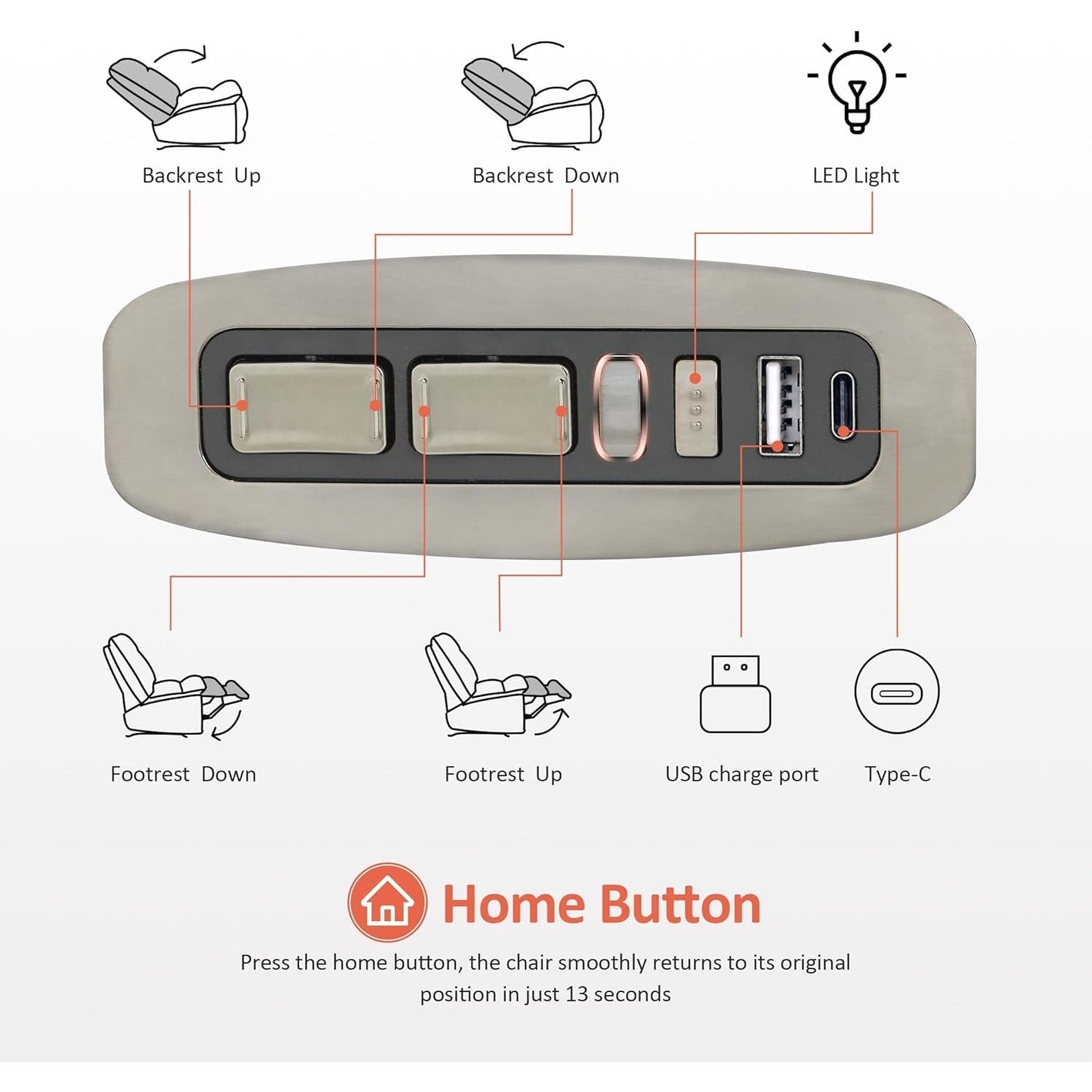 - RÉINITIALISATION EN UNE TOUCHE ET ÉCLAIRAGE LED. Appuyez sur le bouton d'accueil et le fauteuil reprend sa position initiale en seulement 13 secondes. Les deux ports USB et Type-C intégrés à l'accoudoir permettent de connecter n'importe quel téléphone ou tablette, et l'éclairage LED offre une ambiance relaxante.