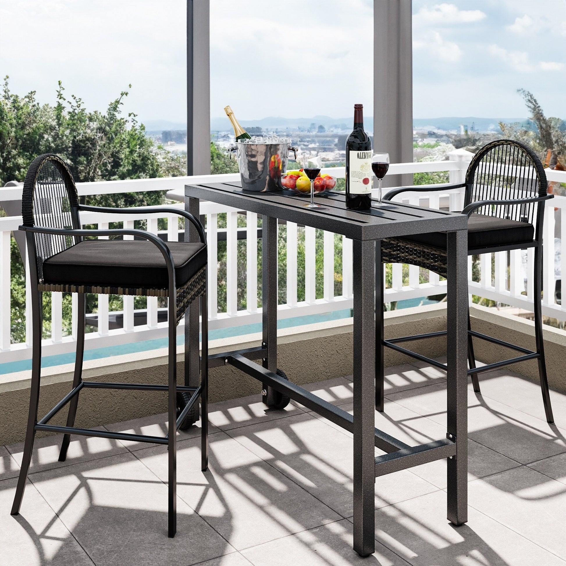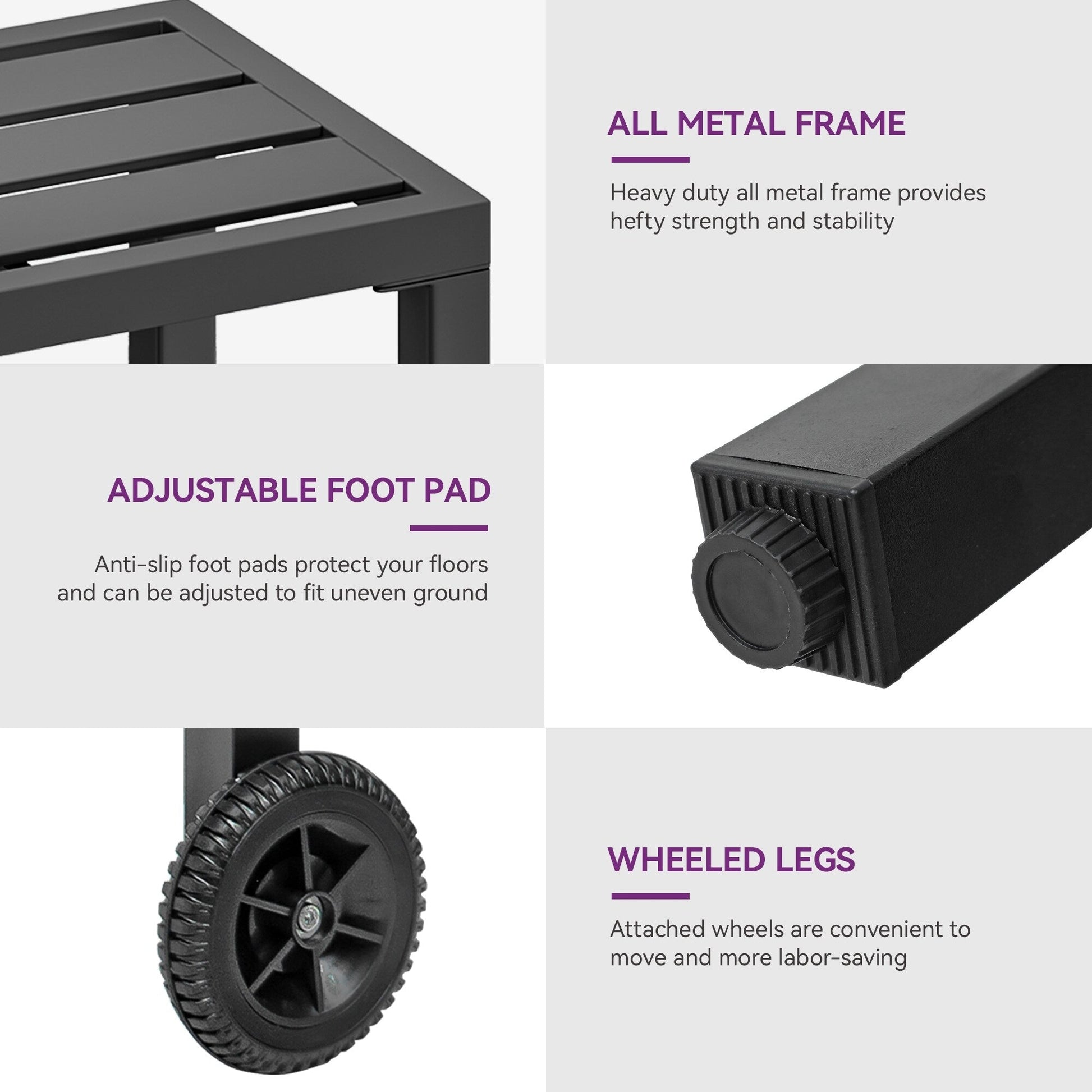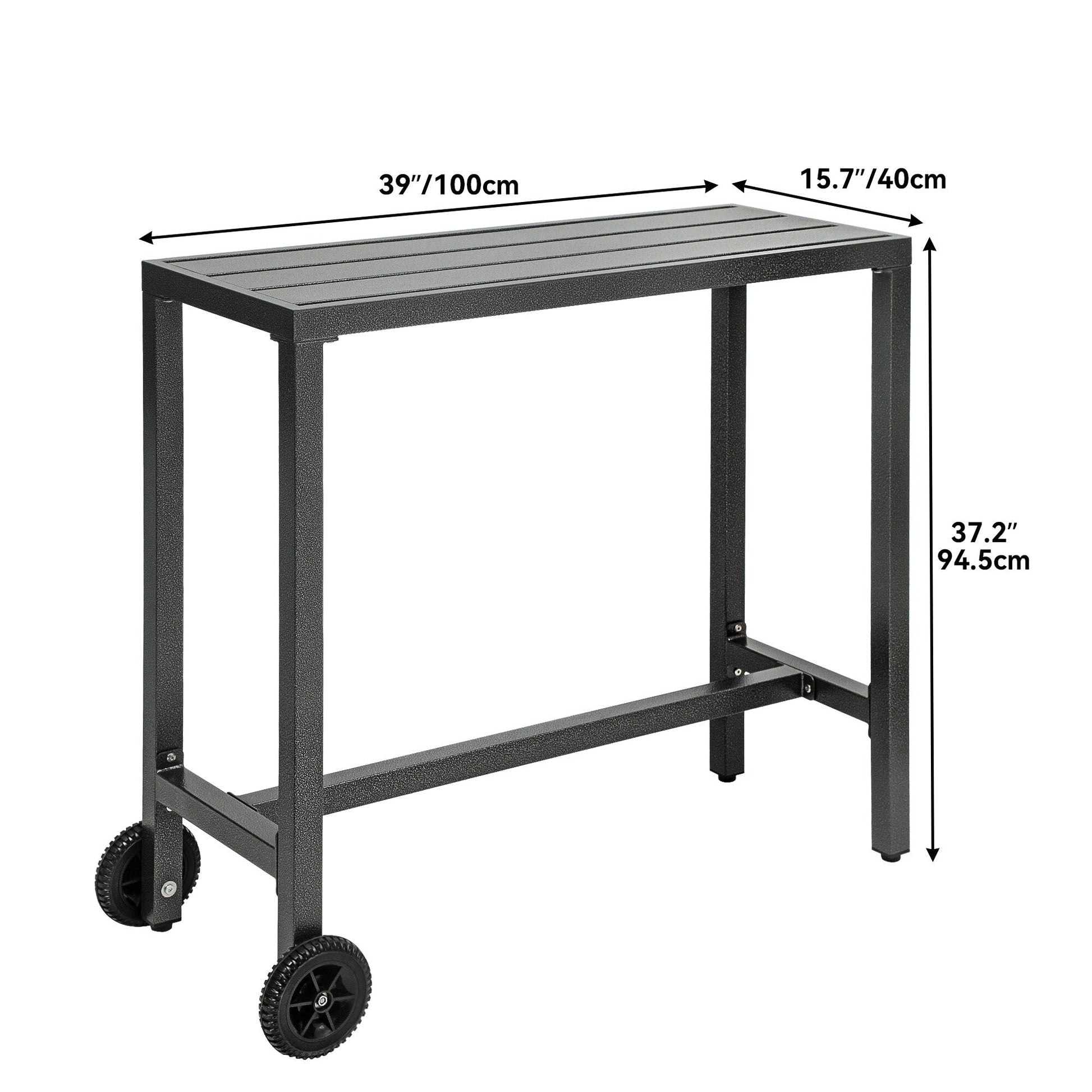 Notre table de bar d'extérieur est un ajout élégant et robuste à votre espace extérieur. Fabriquée en métal de haute qualité avec une finition thermolaquée, cette table est durable et résistante et supporte une charge maximale de 120 kg, ce qui lui permet de supporter sans effort des charges importantes. De plus, ses roulettes sur un côté facilitent son déplacement et son repositionnement.