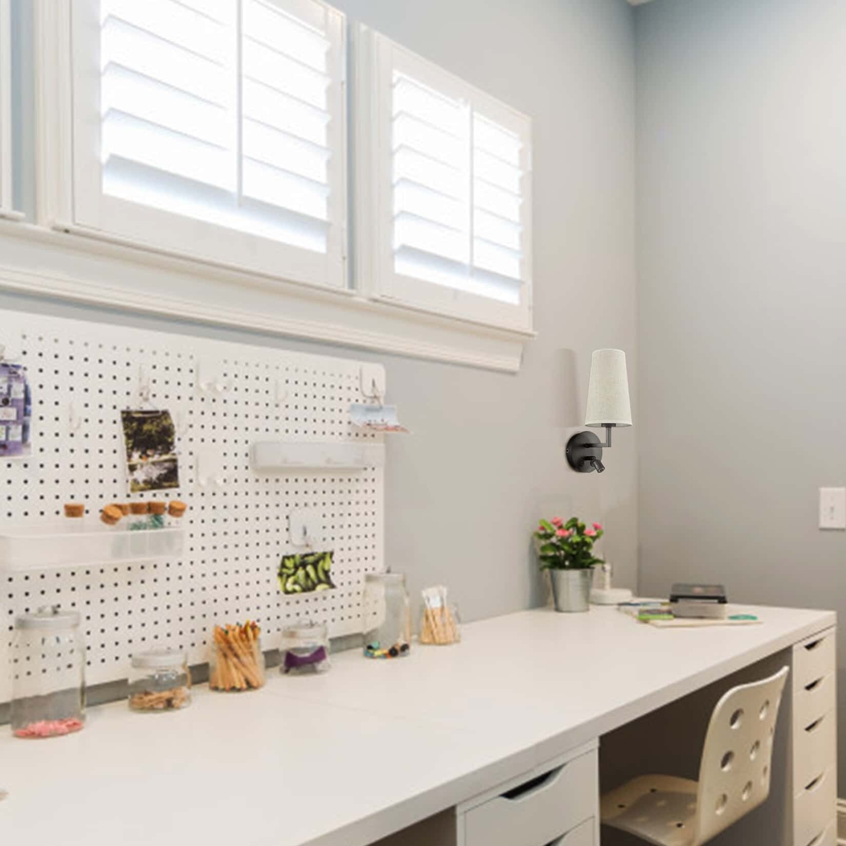 Cette applique murale en laiton doré ou noir est composée d'une plaque métallique ronde avec port de charge USB et d'un abat-jour en tissu blanc en forme de seau, créant une décoration à la fois classique et moderne. L'interrupteur de gauche commande la liseuse LED, tandis que celui de droite commande l'ampoule E26. (Ampoule non incluse)
