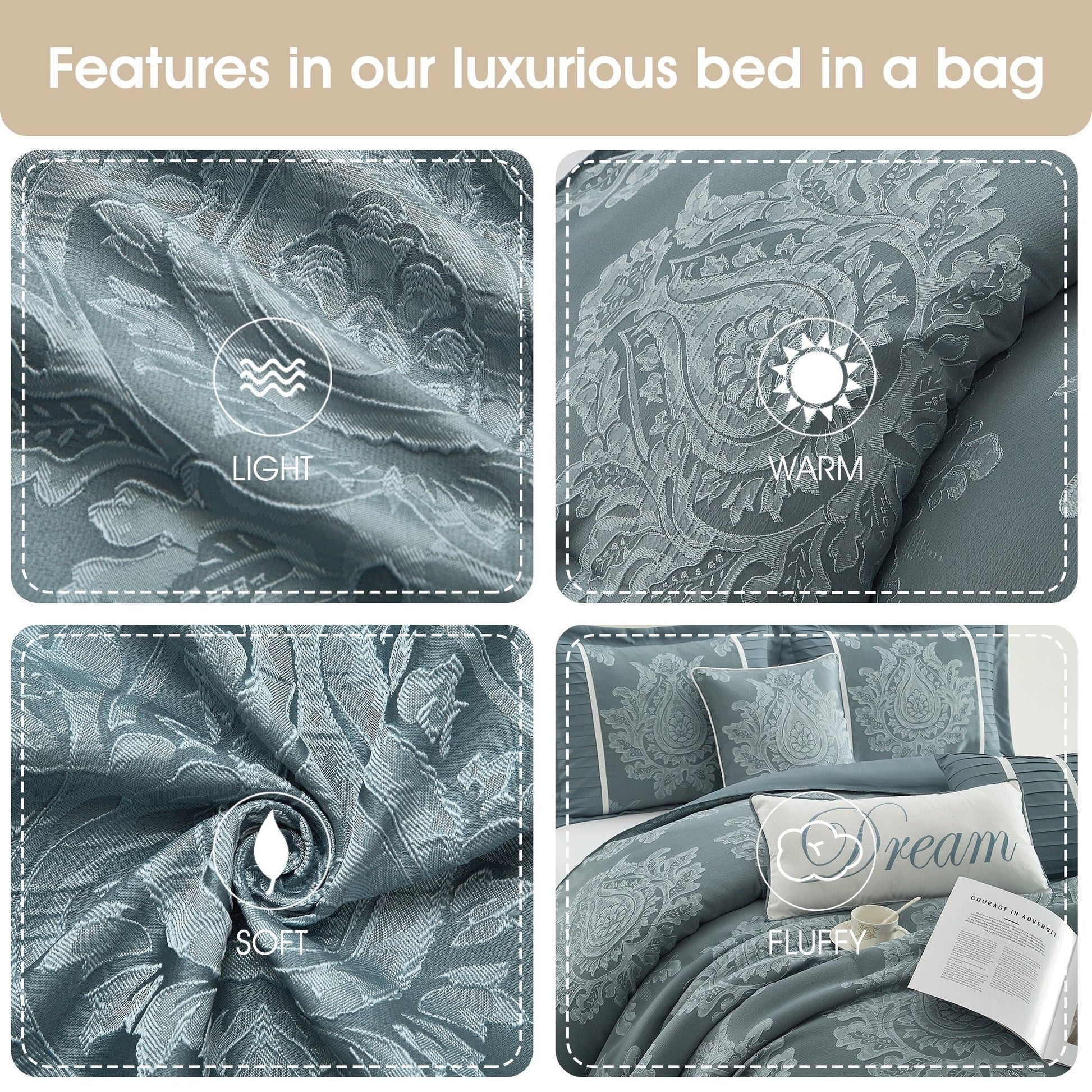 Insufflez une touche d'élégance intemporelle à votre chambre avec notre luxueux ensemble de couettes 7 pièces. La couette et les taies d'oreiller raffinées arborent fièrement un superbe motif médaillon jacquard avec une bordure plissée, créant un effet visuel saisissant et dimensionnel. Confectionné en tissu jacquard texturé, cet ensemble apporte une touche de sophistication et de charme à tous les styles de décoration. Léger et idéal en toutes saisons, il sublime l'ambiance de votre espace grâce à ses détails raffinés et son design classique.