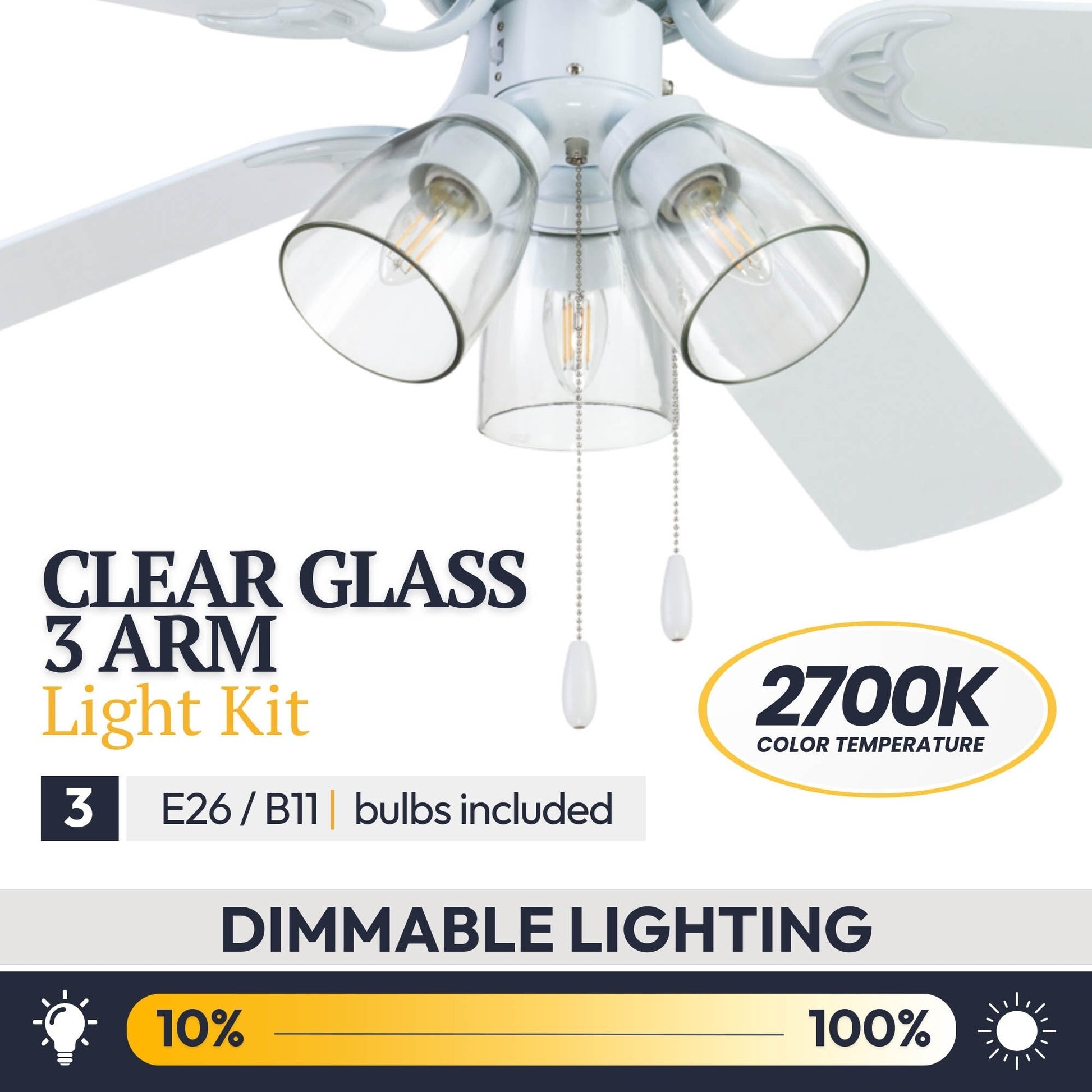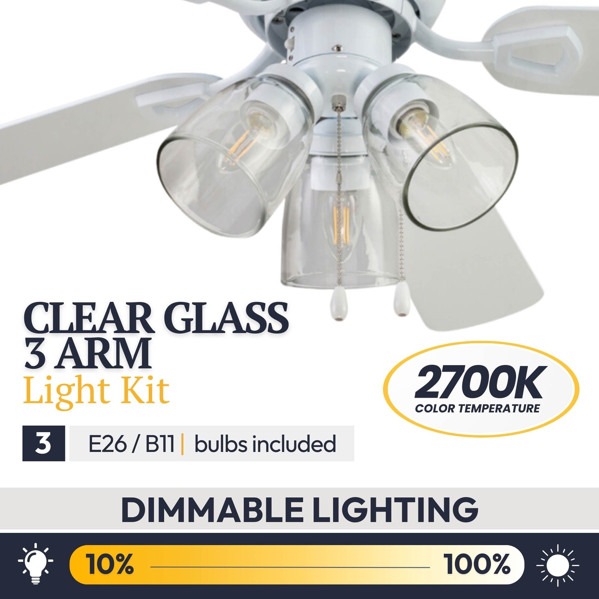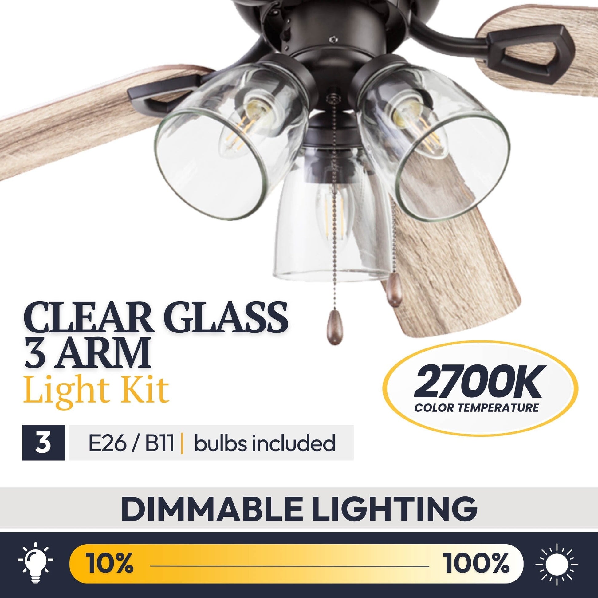 - VERRE TRANSPARENT : Ce ventilateur de plafond intérieur est doté d'un kit d'éclairage ramifié en verre transparent abritant 3 ampoules E26/Moyennes (Standard)/B11 (incluses).