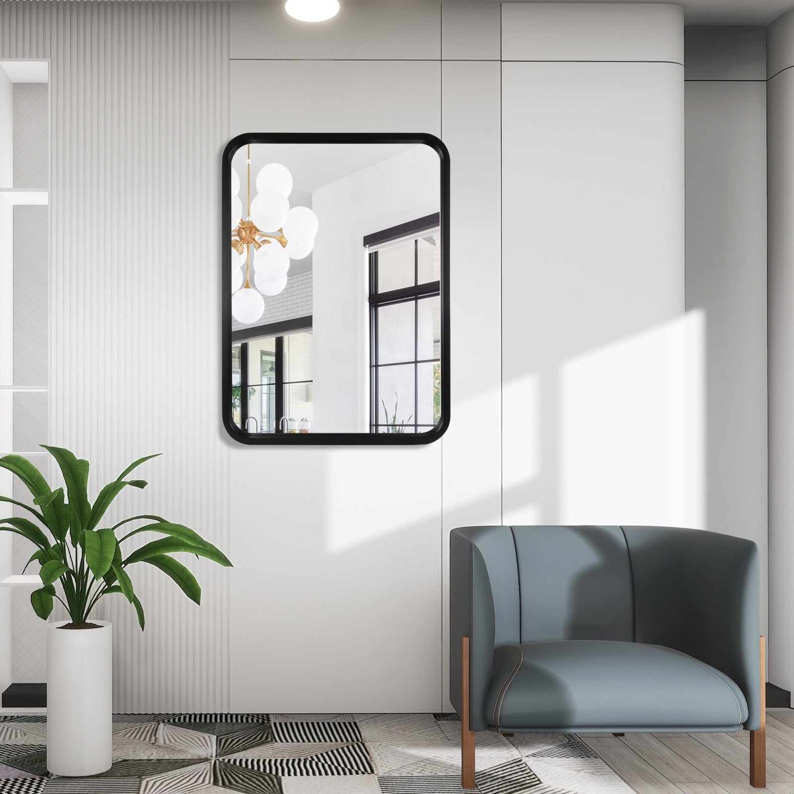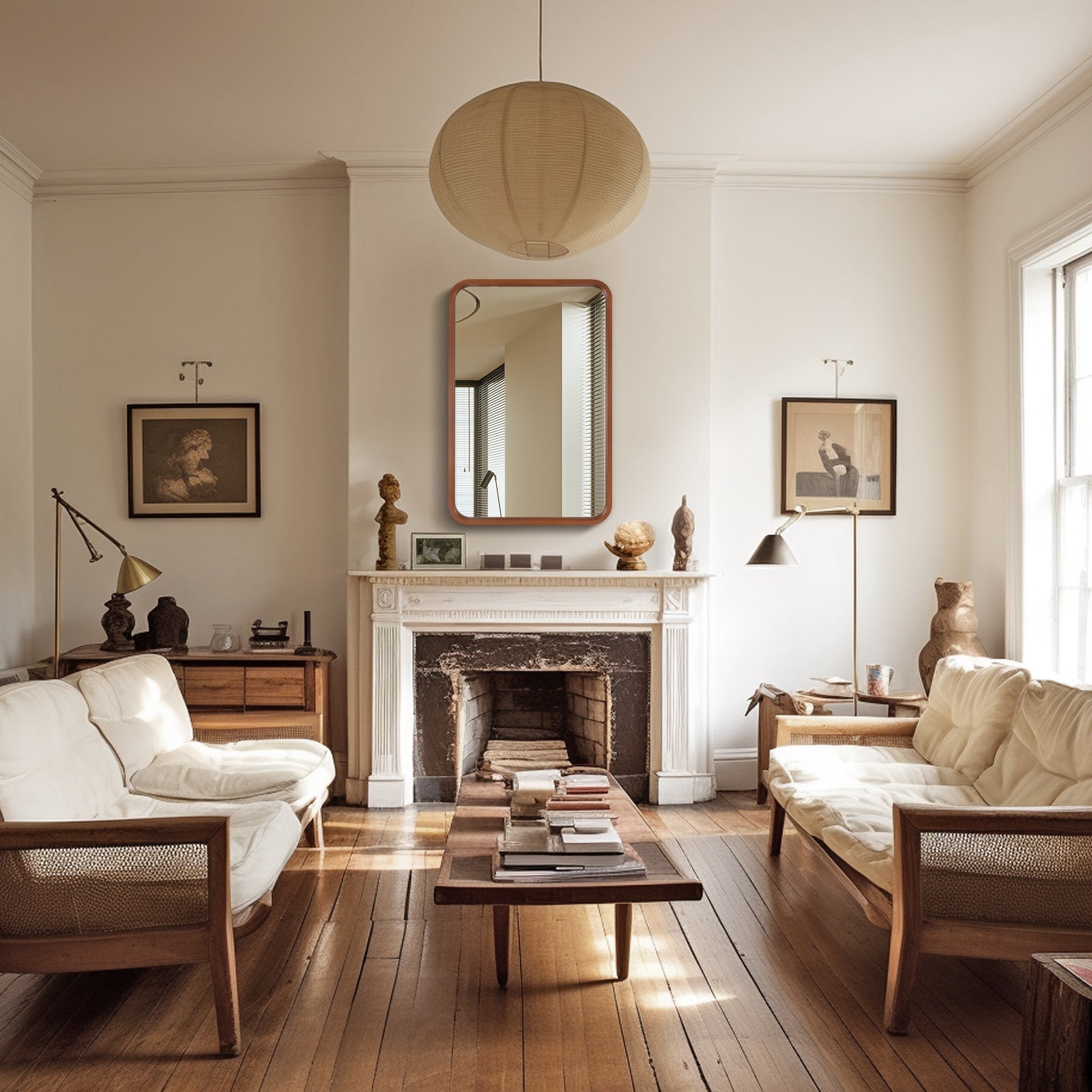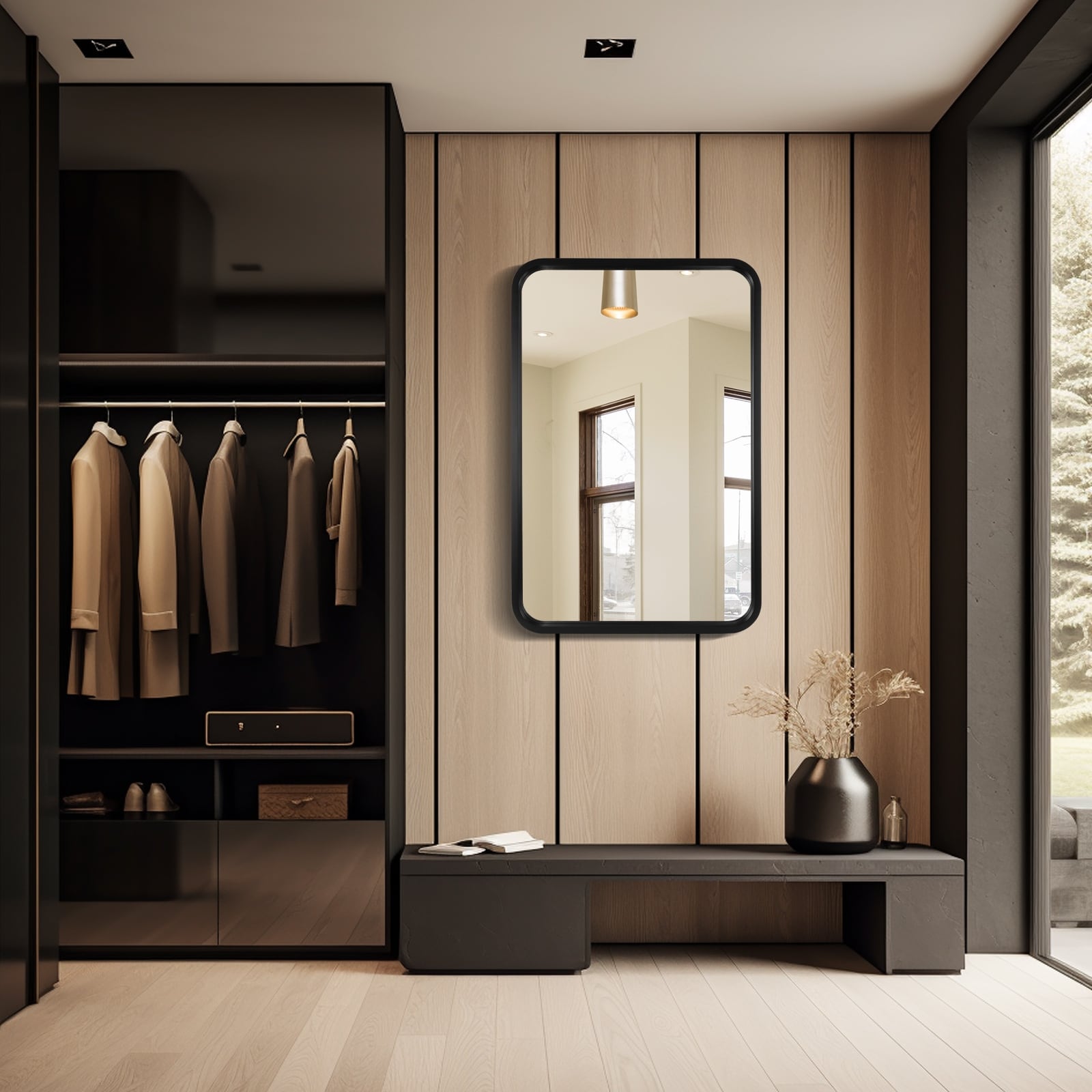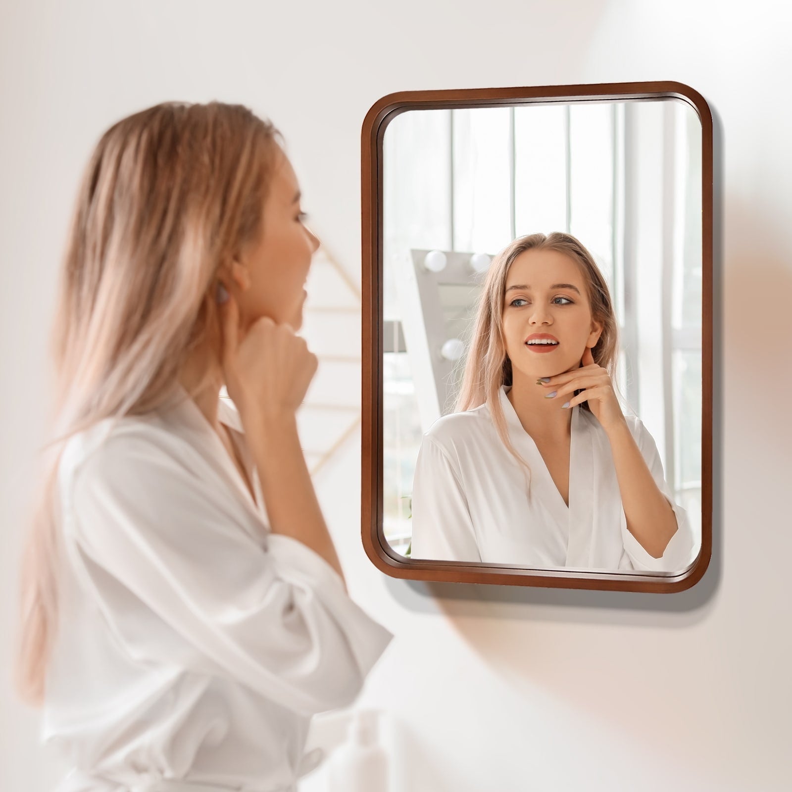 Miroir mural rectangulaire à coins arrondis de style ferme avec cadre en bois massif