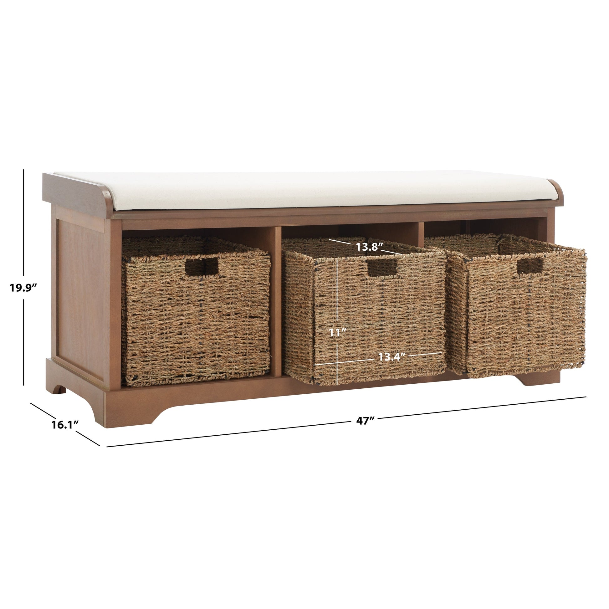 Ce banc de rangement est idéal pour ranger vos bottes dans l'entrée ou vos chaussures de jardin dans le vestiaire. Fabriqué en pin à la finition lisse, ce meuble est doté de trois paniers tressés amovibles pour un rangement facile, et un coussin en coton blanc complète son style avec confort et charme campagnard.