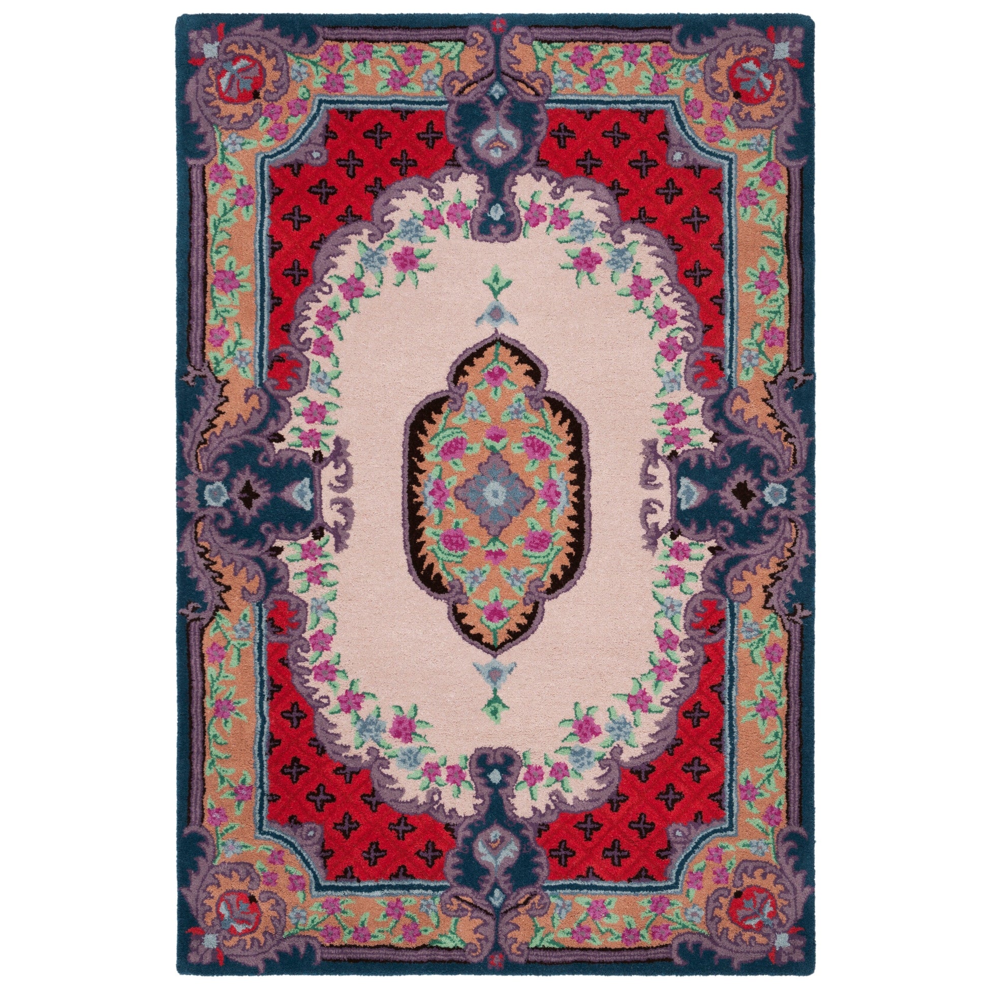 Découvrez notre somptueux tapis d'appoint de 60 x 90 cm, confectionné dans un luxueux mélange de teintes ivoire et rose délicat qui insuffle chaleur et élégance à votre intérieur. Ce tapis au design raffiné est entièrement réalisé à la main par des artisans indiens, garantissant ainsi son caractère unique. Avec une hauteur de velours confortable de 1 cm, notre tapis en laine est non seulement visuellement époustouflant, mais aussi agréablement moelleux sous les pieds, offrant un confort douillet aux espaces intimes de votre maison. La technique de tuftage à la main, méticuleuse, témoigne de sa qualité et de sa durabilité, faisant de ce tapis un atout précieux pour votre décoration. Son design, alliant tradition et modernité, arbore un motif d'une beauté symétrique rayonnante. Il présente des détails ornementaux et un motif central captivant, entouré de bordures travaillées qui encadrent le dessin avec élégance. L'harmonie des couleurs est rehaussée de touches florales, lui conférant un charme classique revisité. Apportez une touche de luxe à votre salon, votre chambre ou votre bureau avec ce trésor capitonné à la main, venu d'Inde, qui sublimera votre intérieur par son raffinement et son attrait intemporel.