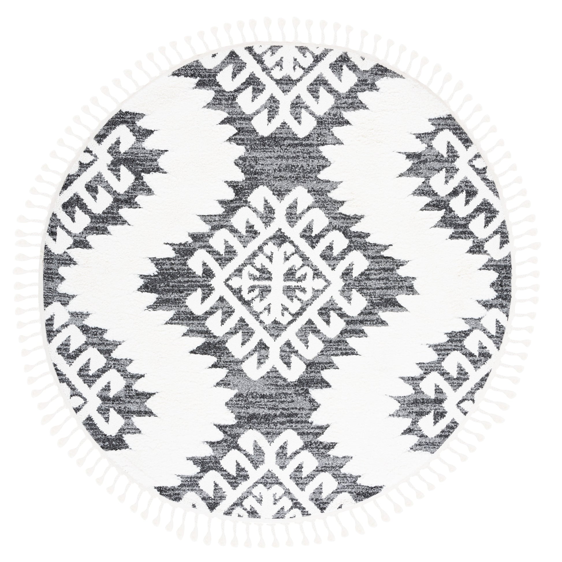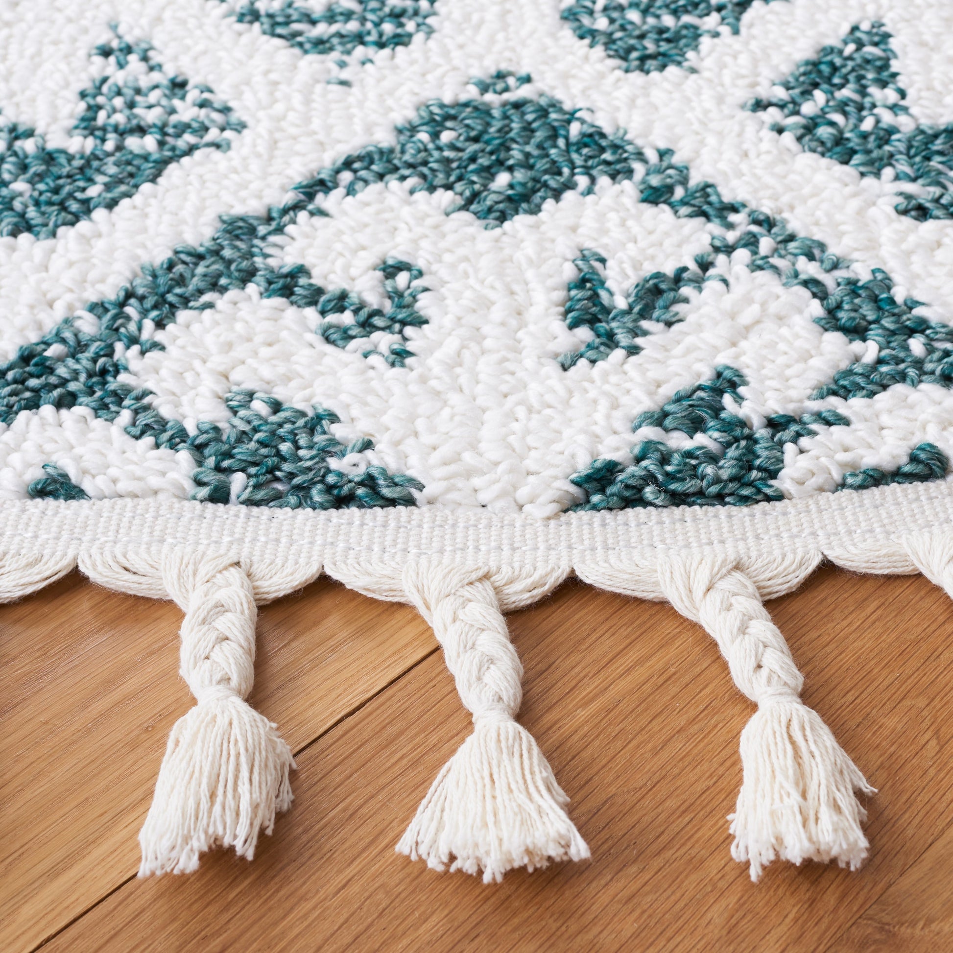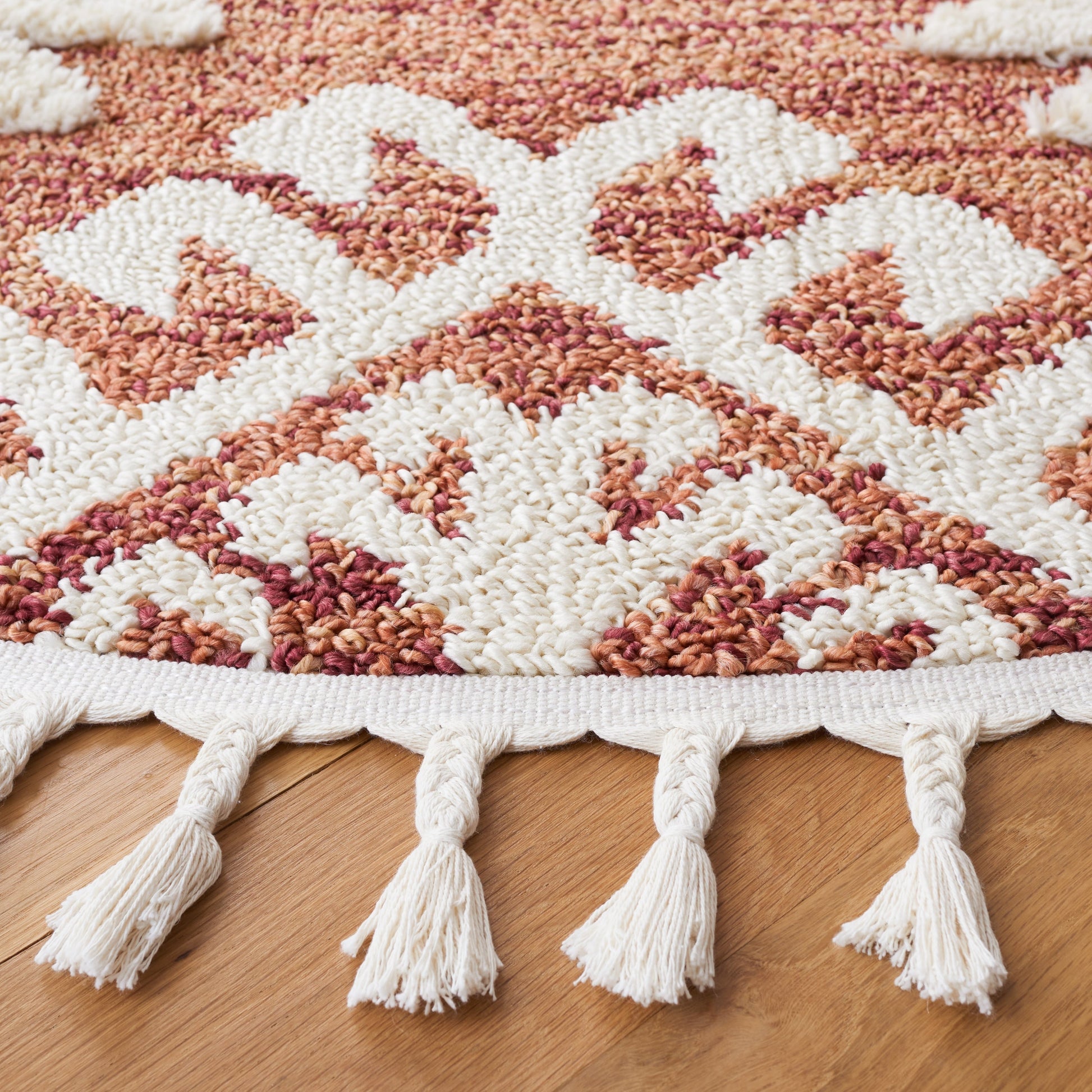 - Pompons tressés chics : Le style bohème de ce tapis est rehaussé par d’élégants pompons tressés.