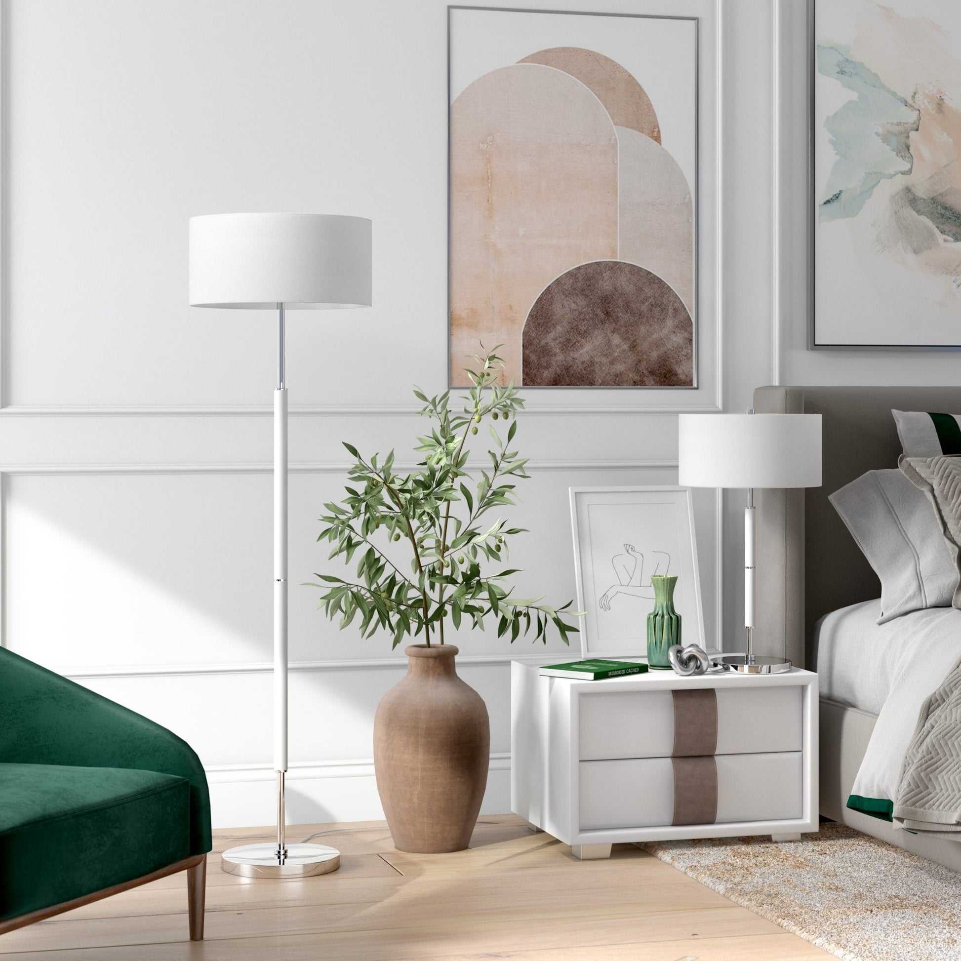 Apportez une touche d'originalité à votre intérieur avec ce lampadaire contemporain bicolore. Ses couleurs neutres et tendance s'harmonisent parfaitement avec des accents métalliques brillants pour sublimer votre décoration. Son abat-jour cylindrique généreux peut accueillir deux ampoules pour diffuser un éclairage optimal là où vous en avez besoin.