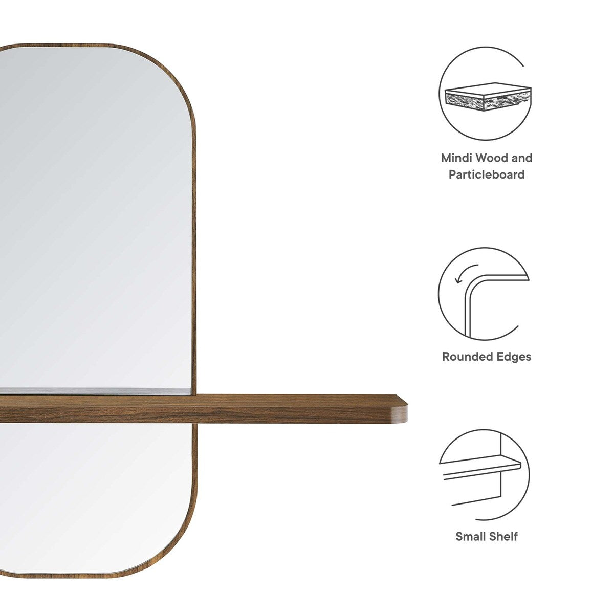Le miroir Solstice apporte une touche de sophistication à tous les espaces. Alliance réussie de styles contemporain et traditionnel, ce miroir rectangulaire aux bords arrondis et au design divisé en deux parties est l'élément décoratif idéal pour une entrée, un vestibule, mais aussi pour votre salon, votre chambre, votre salle de bain ou votre coiffeuse. Fabriqué en bois de mindi et en panneaux de particules avec un revêtement stratifié imitation bois, ce miroir est conçu pour durer des années et ajoutera une note d'élégance à votre intérieur. Une étagère intégrée permet de ranger facilement de petits objets comme des clés, des produits de toilette et autres accessoires. Facile à monter, ce miroir mural deviendra sans aucun doute un magnifique atout pour votre maison.