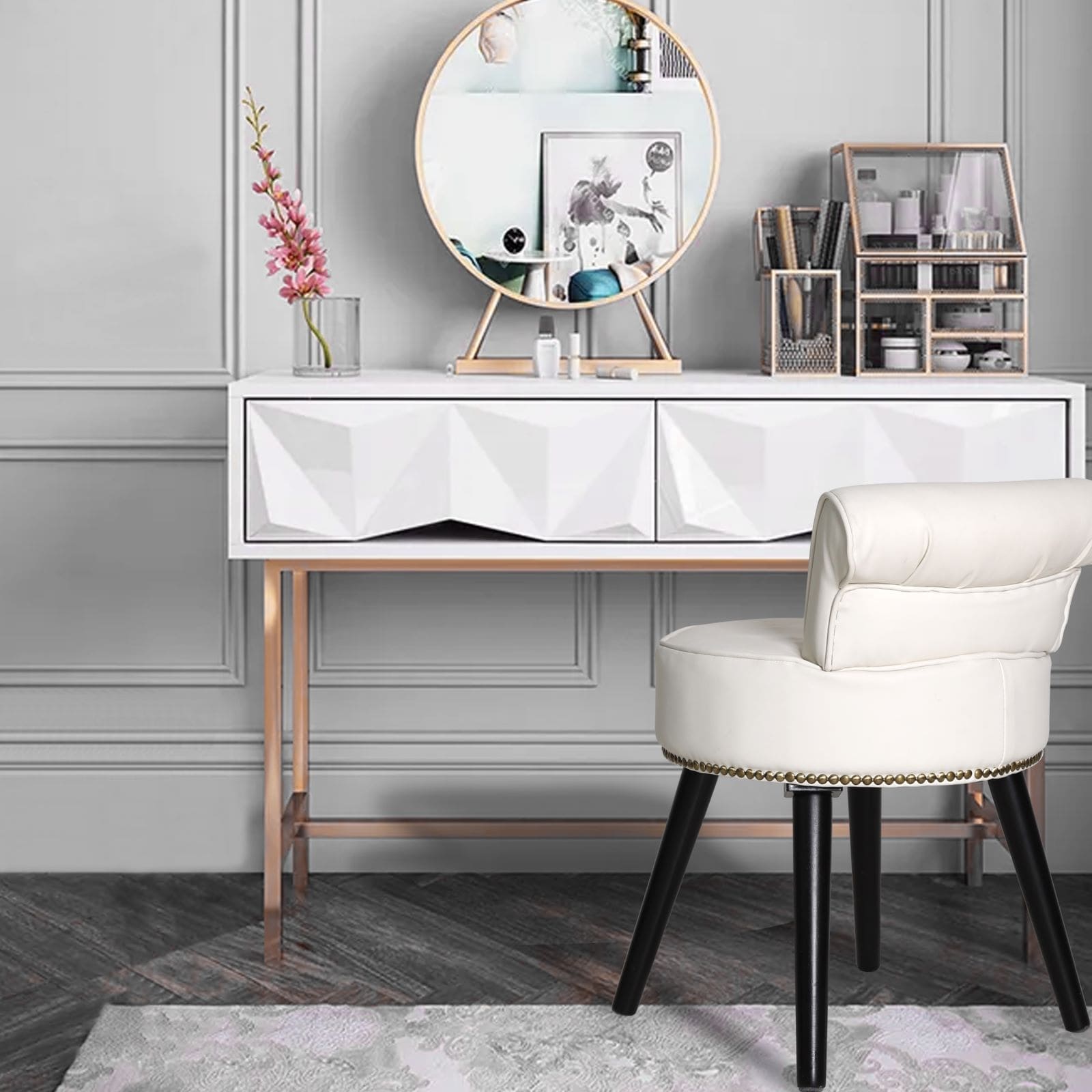 Sublimez votre routine matinale avec notre tabouret de coiffeuse VEIKOUS et ajoutez une touche de sophistication à votre journée. Ce tabouret polyvalent et élégant vous accompagnera lors de votre maquillage, mais vous offrira également un espace idéal pour écrire, réfléchir ou lire, tout en dégageant un charme classique. Il est doté de pieds en bois massif et d'une assise ronde inclinable pour un confort optimal. Son intérieur en lin, velours ou cuir, son assise rembourrée de mousse et son capitonnage discret contribuent à son allure intemporelle. Choisissez parmi une variété de coloris celui qui s'harmonisera le mieux avec votre décoration.